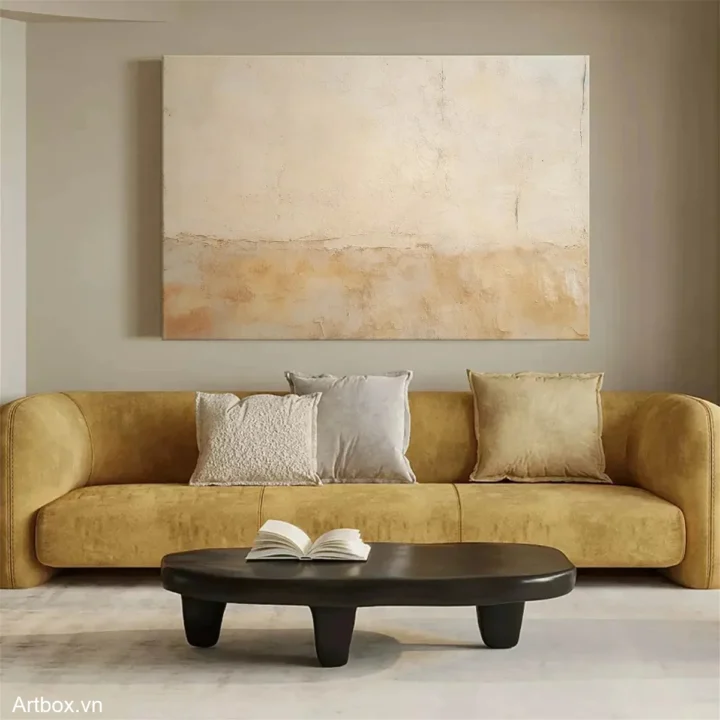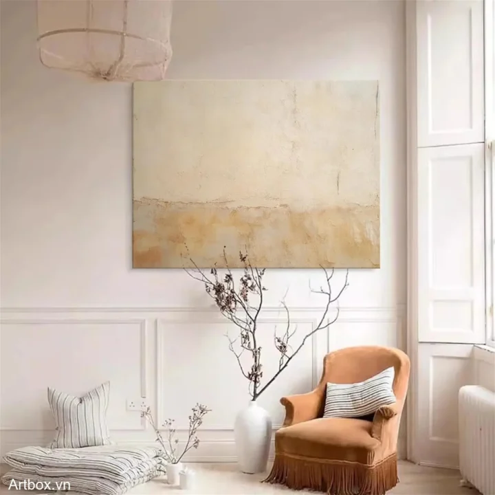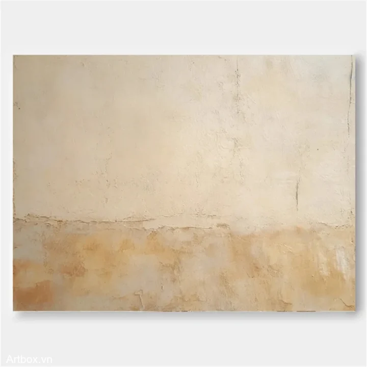 Bức tranh mang đến cảm giác êm đềm với tông màu nâu be nhẹ nhàng, hòa quyện giữa sắc thái ấm áp và sự tinh tế. Kỹ thuật texture nổi tạo chiều sâu, khiến cho bề mặt tranh trở nên sống động và gần gũi. Các lớp màu hòa quyện, gợi lên hình ảnh của đất trời, mang lại sự thư thái và bình yên cho không gian. Đây là một tác phẩm nghệ thuật hoàn hảo cho những ai yêu thích sự đơn giản, nhưng vẫn đầy cảm xúc và sâu sắc.