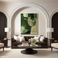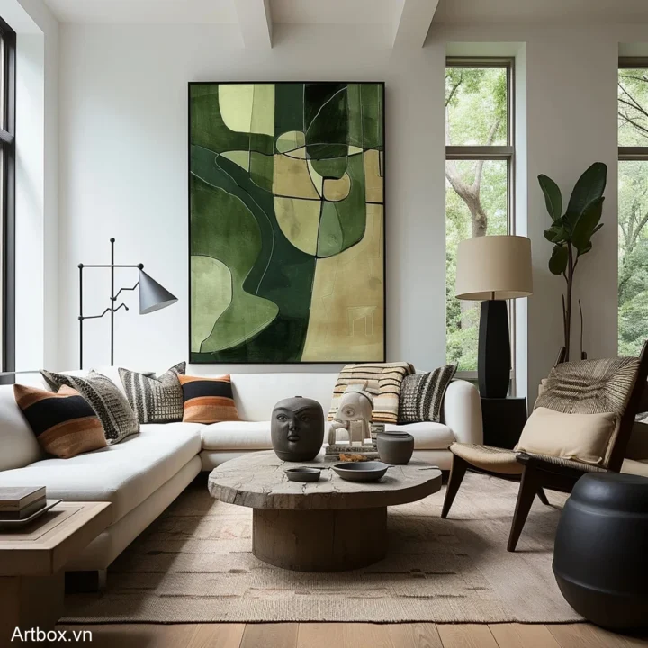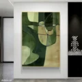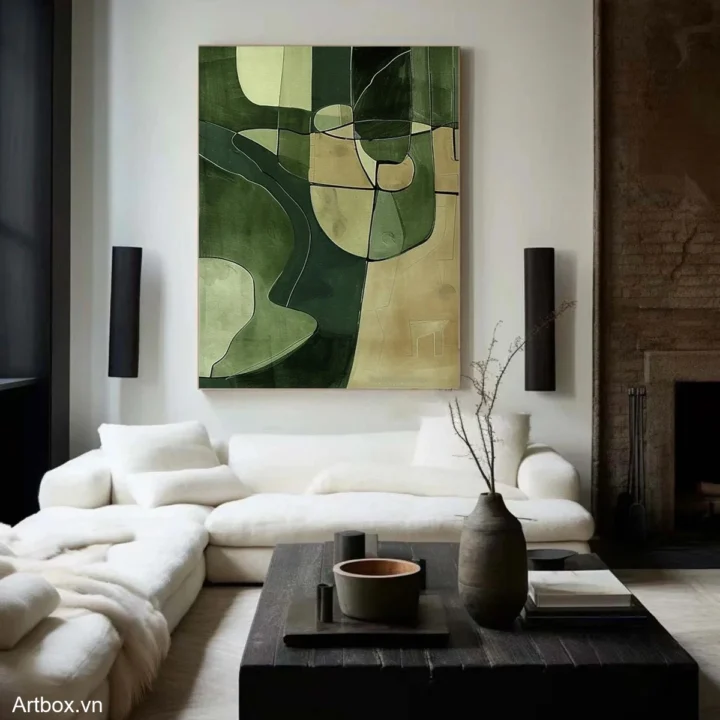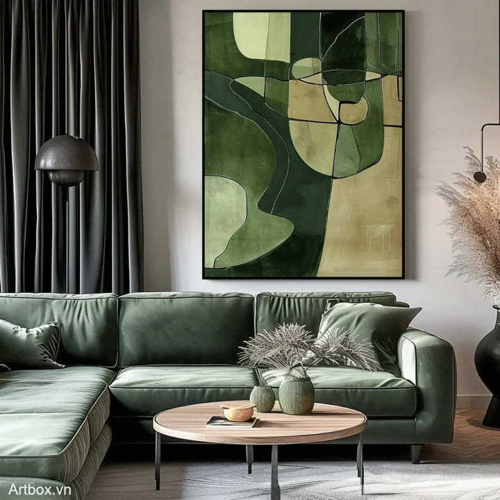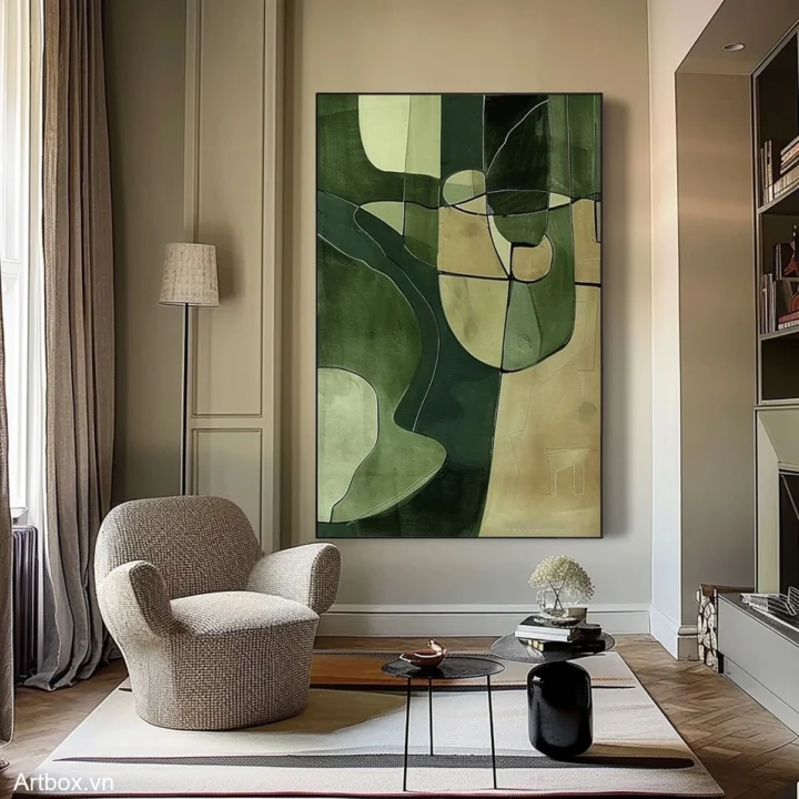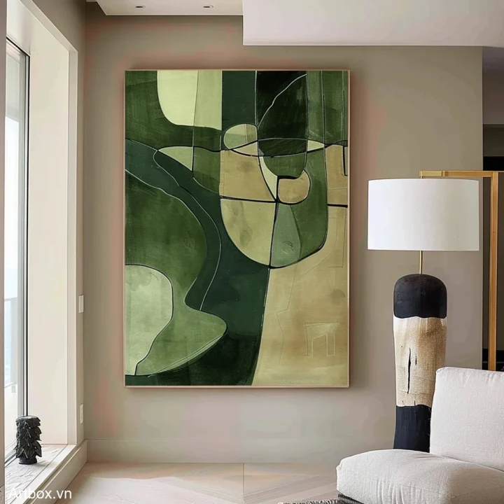 Bức tranh mang đến một cảm giác thư thái với những sắc xanh lá tươi mát, hòa quyện giữa các hình khối trừu tượng. Những đường nét mềm mại và giản dị tạo nên một không gian nhẹ nhàng, dễ chịu. Tông màu chủ đạo là xanh lá, kết hợp với những mảng màu nhạt hơn, tạo chiều sâu và sự phong phú cho bức tranh. Kỹ thuật vẽ phẳng giúp làm nổi bật sự tinh tế và hiện đại, khiến nó trở thành điểm nhấn hoàn hảo cho không gian sống hoặc làm việc. Bức tranh không chỉ là một tác phẩm nghệ thuật mà còn là một nguồn cảm hứng cho sự sáng tạo và bình yên.