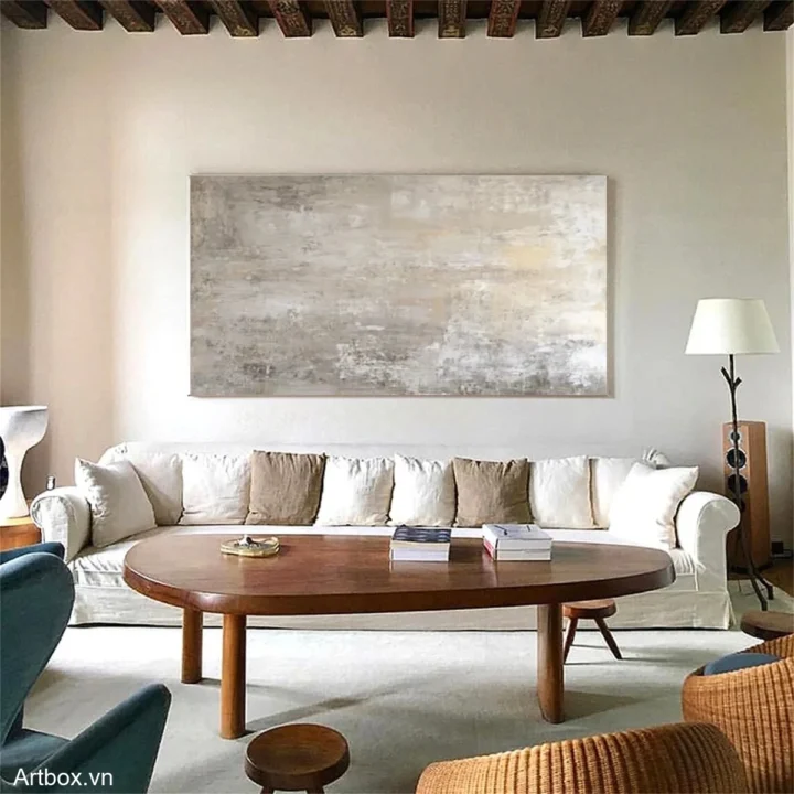 Bức tranh mang đến một không gian trừu tượng đầy cảm xúc, với những đường nét mềm mại và màu xám chủ đạo. Sự hòa quyện giữa các sắc thái xám và những điểm nhấn nhẹ nhàng tạo nên chiều sâu và sự tĩnh lặng. Kỹ thuật vẽ phẳng giúp bức tranh trở nên thanh thoát, mang lại cảm giác hiện đại và tối giản. Chất liệu như mờ ảo, gợi lên sự bình yên và thư thái, phù hợp cho những không gian cần sự tập trung và yên tĩnh. Đây là một tác phẩm nghệ thuật thể hiện sự tinh tế, đồng thời tạo điểm nhấn cho không gian sống.
