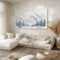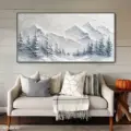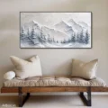 Bức tranh mang đến một khung cảnh núi non hùng vĩ, nơi những đỉnh núi phủ đầy tuyết trắng xóa hòa quyện cùng những cánh rừng thông xanh thẳm. Kỹ thuật texture nổi tạo chiều sâu và sự sống động cho cảnh vật, khiến người xem như cảm nhận được cái lạnh của không khí trong lành. Màu xám chủ đạo mang lại cảm giác bình yên, tĩnh lặng, như một khoảnh khắc lắng đọng giữa thiên nhiên. Phong cách hiện đại kết hợp với nét đẹp Wabi-Sabi tạo nên sự hài hòa, giản dị nhưng đầy nghệ thuật, khiến bức tranh trở thành điểm nhấn thú vị trong không gian sống.