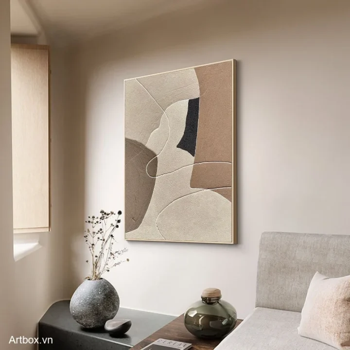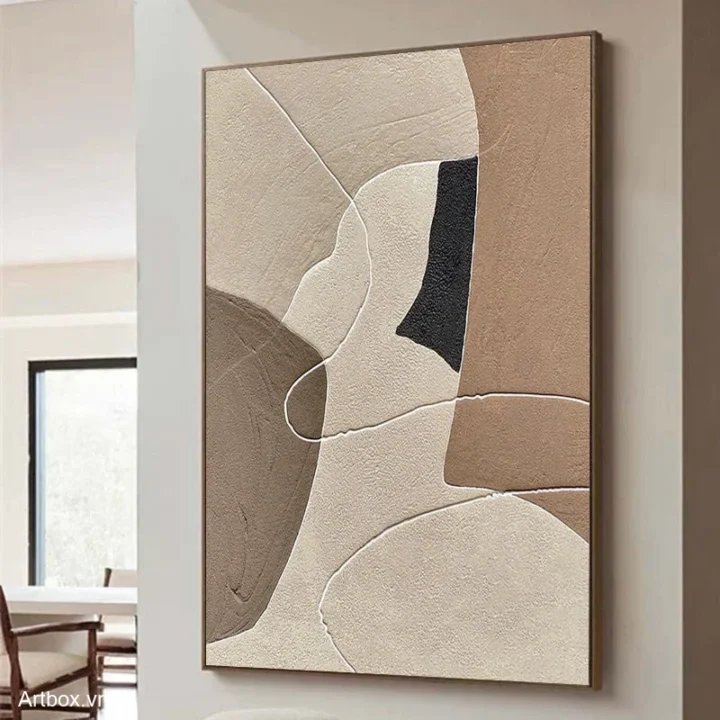 Bức tranh mang đến một không gian trừu tượng đầy cảm xúc với các hình khối mềm mại, hòa quyện giữa các tông màu nâu be ấm áp. Những đường nét uốn lượn tạo cảm giác nhẹ nhàng, thanh thoát, như những làn sóng chảy trôi trong không gian. Kỹ thuật texture nổi làm tăng chiều sâu cho tác phẩm, mang đến sự sống động và gần gũi. Đây là một tác phẩm nghệ thuật hoàn hảo cho những không gian cần sự yên bình và ấm cúng, khơi gợi cảm xúc và sáng tạo cho người thưởng thức.
