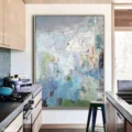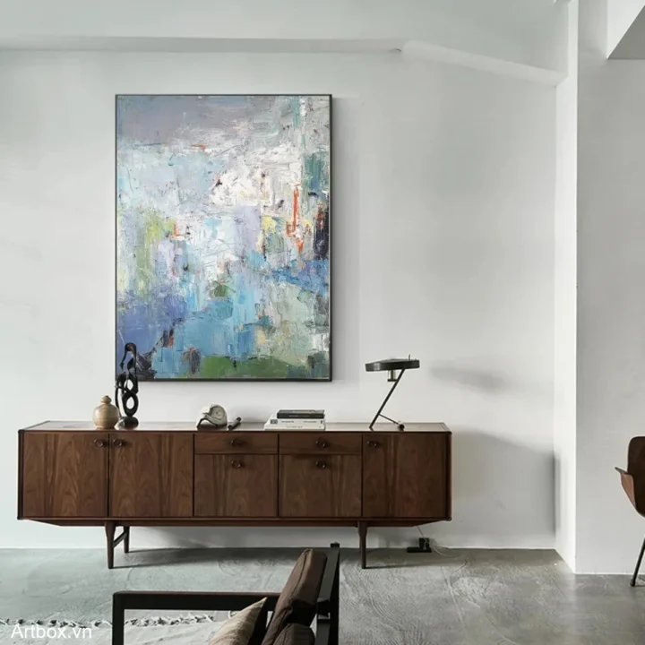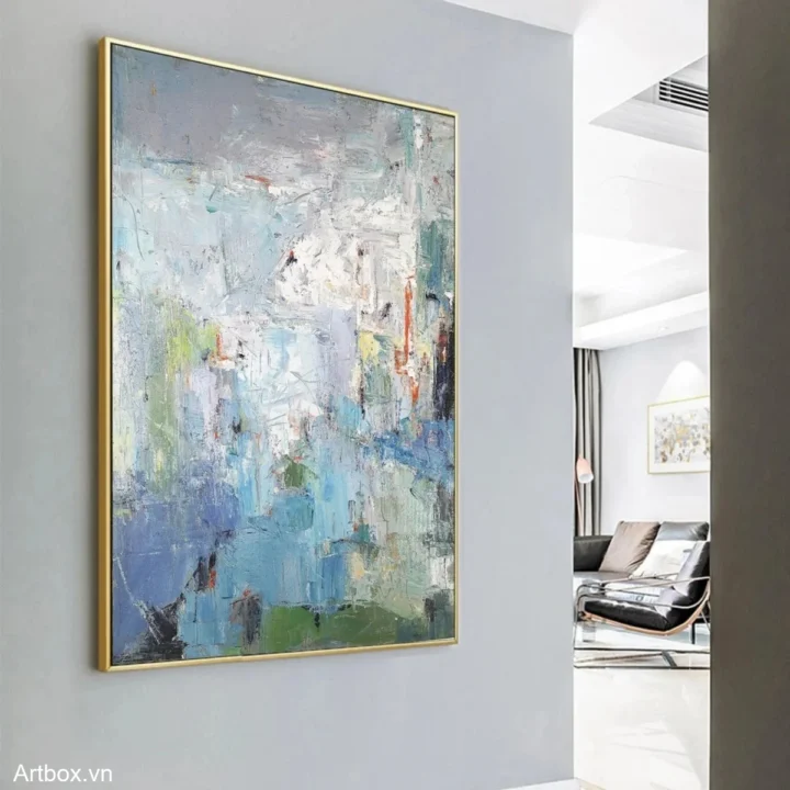 Bức tranh là một tác phẩm trừu tượng đầy sức sống, nơi các màu sắc hòa quyện một cách tinh tế. Các sắc xanh lam và xanh lục tạo nên cảm giác tươi mát, trong khi những vệt màu khác như vàng, đỏ, và trắng thắp sáng bức tranh, mang đến một không gian đầy năng lượng. Kỹ thuật texture nổi tạo chiều sâu, khiến cho bức tranh trở nên sống động và thu hút ánh nhìn. Hình ảnh không cụ thể nhưng lại gợi mở nhiều cảm xúc, tạo cảm giác thư thái và dễ chịu, phù hợp cho những không gian hiện đại như phòng khách hay phòng làm việc.