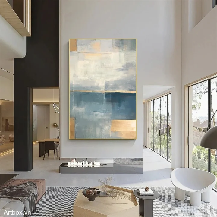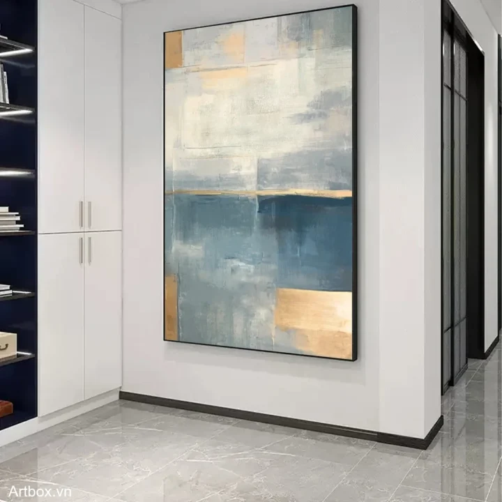 Bức tranh mang đến một không gian trừu tượng đầy cảm xúc với sự kết hợp tinh tế giữa các mảng màu xanh dương và vàng nhạt. Những khối màu được sắp xếp một cách hài hòa, tạo nên sự chuyển động nhẹ nhàng và thanh thoát. Kỹ thuật vẽ phẳng giúp bức tranh trở nên hiện đại, với các đường nét rõ ràng và màu sắc tươi sáng, gợi lên cảm giác yên bình và thư thái. Đây là một tác phẩm nghệ thuật lý tưởng cho không gian sống hoặc làm việc, mang lại sự tươi mới và cảm hứng sáng tạo cho người ngắm nhìn.