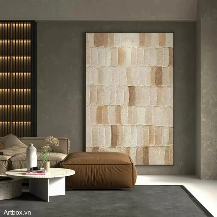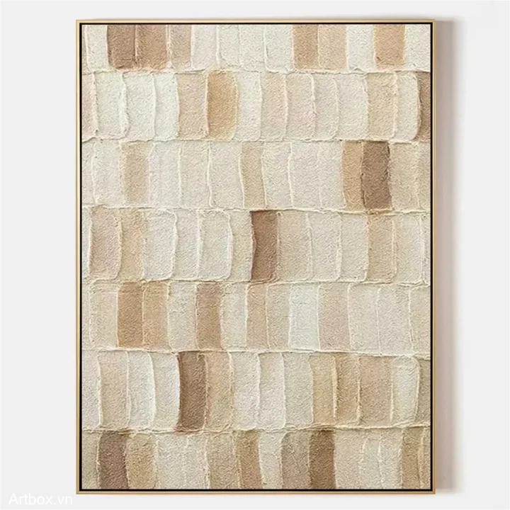 Bức tranh mang đến một cảm giác nhẹ nhàng và ấm cúng với sự hòa quyện của các sắc thái nâu be. Các hình khối được sắp xếp một cách tinh tế, tạo nên một bề mặt có chiều sâu và xúc giác, như một tác phẩm nghệ thuật hiện đại. Sự kết hợp giữa các tông màu nhạt và đậm mang lại cảm giác thư giãn, dễ chịu cho người nhìn. Đây là một lựa chọn hoàn hảo cho không gian sống, tạo điểm nhấn nhẹ nhàng nhưng đầy ấn tượng.