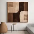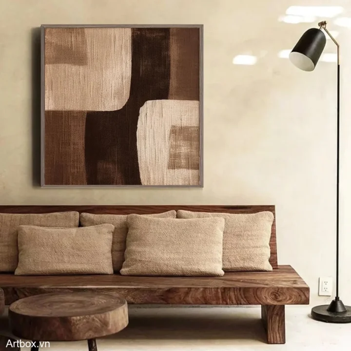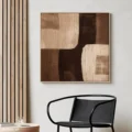 Bức tranh mang đến một cảm giác bình yên và ấm áp với những sắc thái nâu be nhẹ nhàng. Các khối hình học được sắp xếp một cách hài hòa, tạo nên sự cân bằng giữa các tông màu sáng và tối. Kỹ thuật texture nổi làm nổi bật chiều sâu và sự sống động của bức tranh, khiến người xem cảm nhận được sự chuyển động tinh tế trong từng nét vẽ. Phong cách hiện đại kết hợp với yếu tố Wabi-Sabi tạo ra một vẻ đẹp tự nhiên, không hoàn hảo, nhưng lại rất cuốn hút, hoàn hảo cho không gian sống hiện đại.