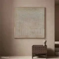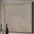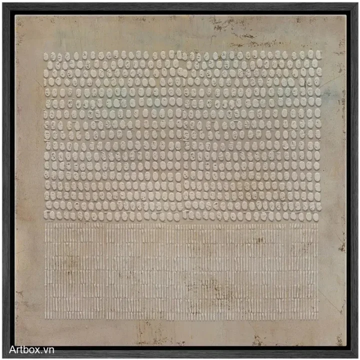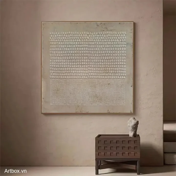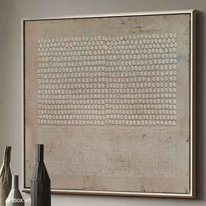 Bức tranh trừu tượng này mang đến một cảm giác tĩnh lặng và bình yên. Với nền nâu be nhẹ nhàng, các hình khối và đường nét được thể hiện qua kỹ thuật texture nổi, tạo nên chiều sâu và sự sống động. Những hình tròn nhỏ, sắp xếp theo hàng, tạo ra một nhịp điệu hài hòa, như những giọt sương sớm mai. Sự kết hợp giữa sự mộc mạc và hiện đại trong phong cách Wabi-Sabi khiến bức tranh trở thành một điểm nhấn ấm cúng, thích hợp cho không gian thư giãn và nghỉ ngơi.