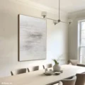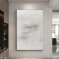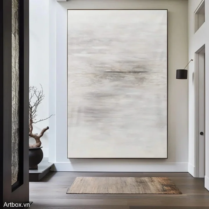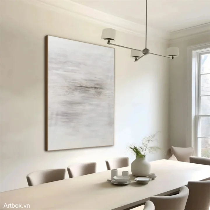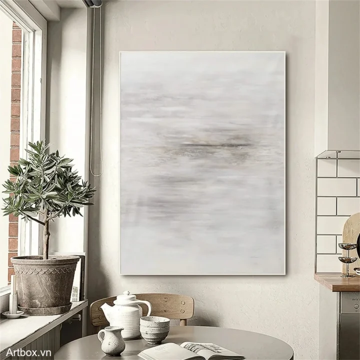 Bức tranh thể hiện một không gian tĩnh lặng và thanh bình, với sự hòa quyện của các sắc thái xám nhẹ nhàng. Các đường nét mờ nhạt và lớp màu chồng lên nhau tạo ra chiều sâu và cảm giác thư giãn. Tác phẩm mang đến cảm xúc dịu nhẹ, khuyến khích sự suy tư và tĩnh lặng trong tâm hồn. Phong cách hiện đại và tối giản của bức tranh làm nổi bật sự thanh thoát, phù hợp với những không gian hiện đại, nơi mà sự đơn giản và tinh tế được coi trọng. Đây là một tác phẩm lý tưởng cho những ai yêu thích sự yên bình và tĩnh lặng trong nghệ thuật.