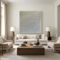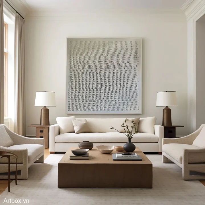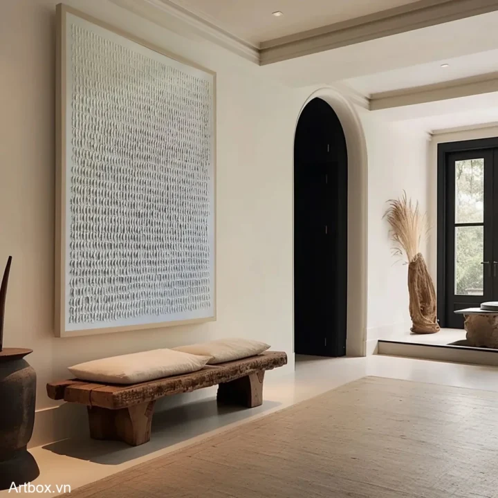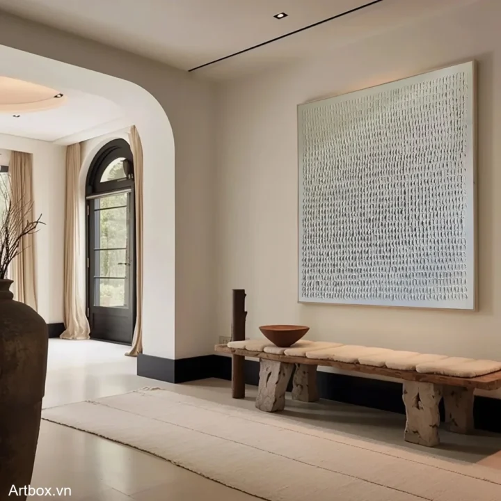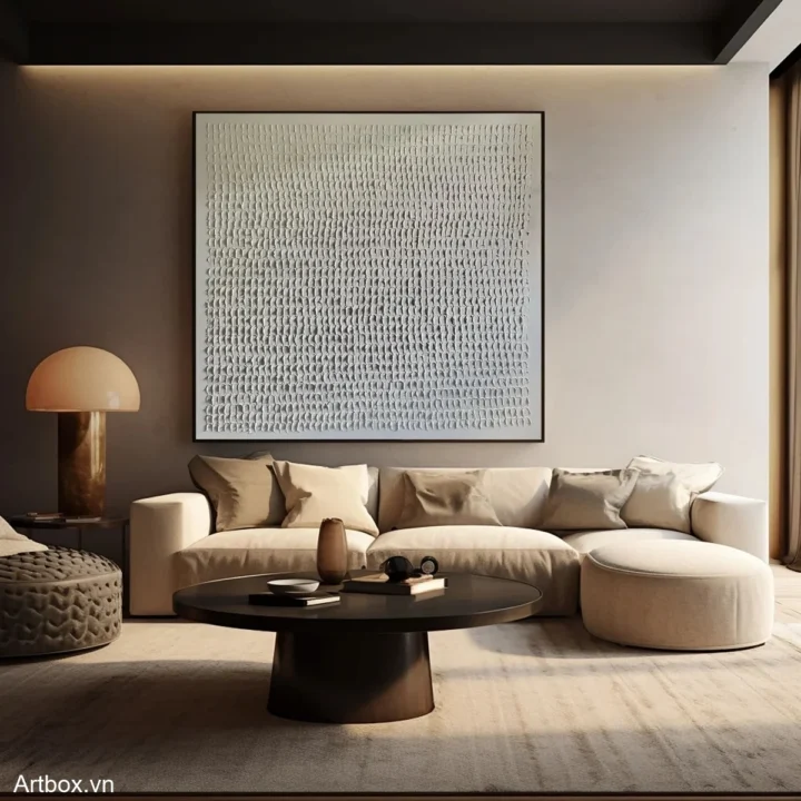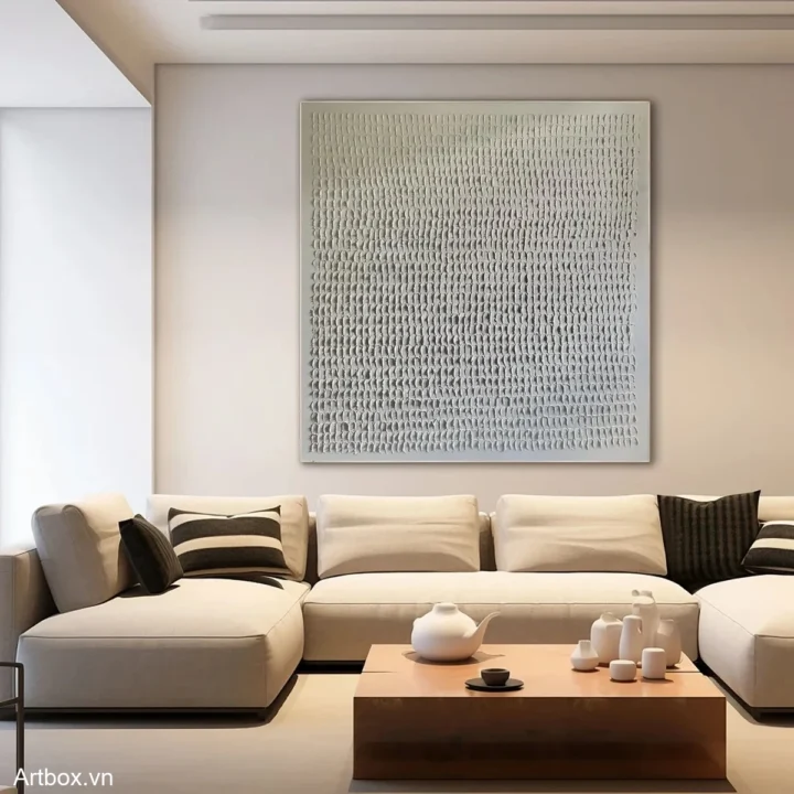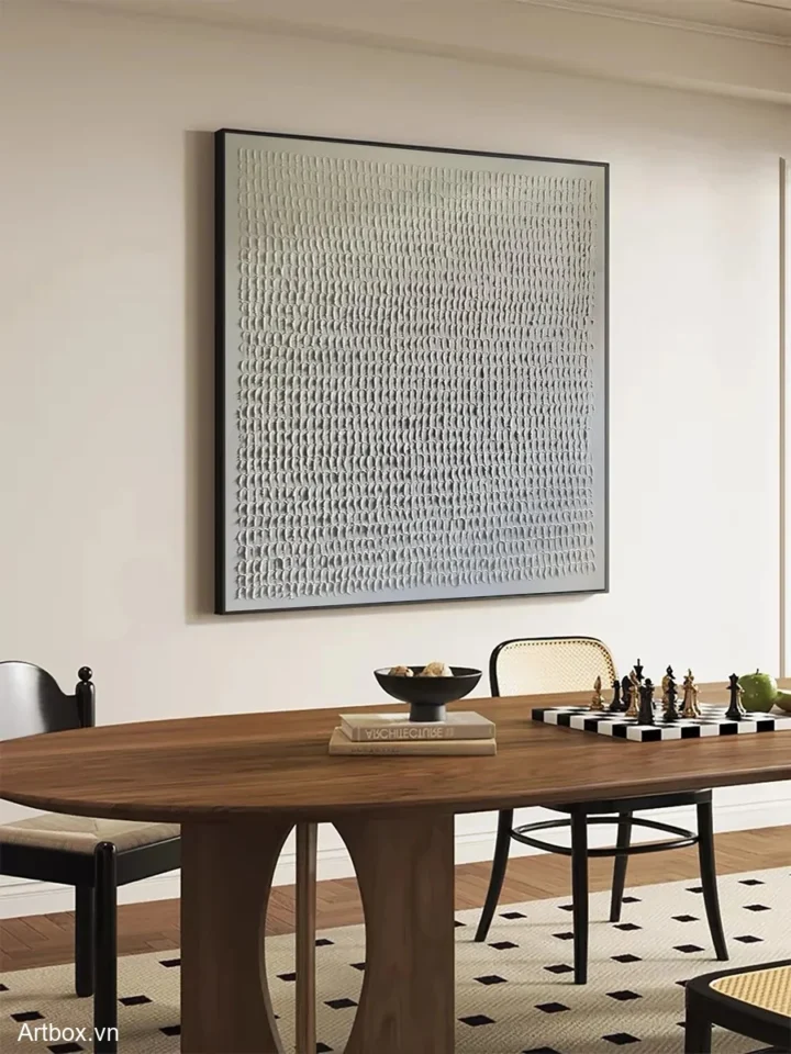 Bức tranh này là một tác phẩm trừu tượng với những đường nét nổi bật, tạo ra một không gian tĩnh lặng và thư giãn. Màu xám chủ đạo mang đến cảm giác nhẹ nhàng, thanh thoát, đồng thời thể hiện sự hiện đại và tối giản. Các chi tiết texture nổi được khéo léo sắp xếp, tạo chiều sâu và sự phong phú cho bức tranh, khiến người xem cảm nhận được sự chuyển động nhẹ nhàng trong tĩnh lặng. Đây là một tác phẩm lý tưởng cho không gian phòng khách hoặc phòng làm việc, nơi mà sự tập trung và bình yên được đề cao.
