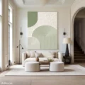 Bức tranh mang đến một cảm giác thanh bình với các đường cong mềm mại, tạo nên sự hòa quyện giữa màu xanh lá và nền trắng tinh khiết. Kỹ thuật texture nổi được sử dụng tinh tế, tạo chiều sâu và sự sống động cho bức tranh. Những đường nét tròn lặp lại không chỉ thể hiện sự tối giản mà còn gợi lên cảm giác yên tĩnh và thư giãn. Màu sắc nhẹ nhàng và bố cục đơn giản làm nổi bật vẻ đẹp tự nhiên, phù hợp cho không gian hiện đại, mang lại một cái nhìn tươi mới và tràn đầy sức sống.