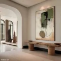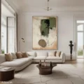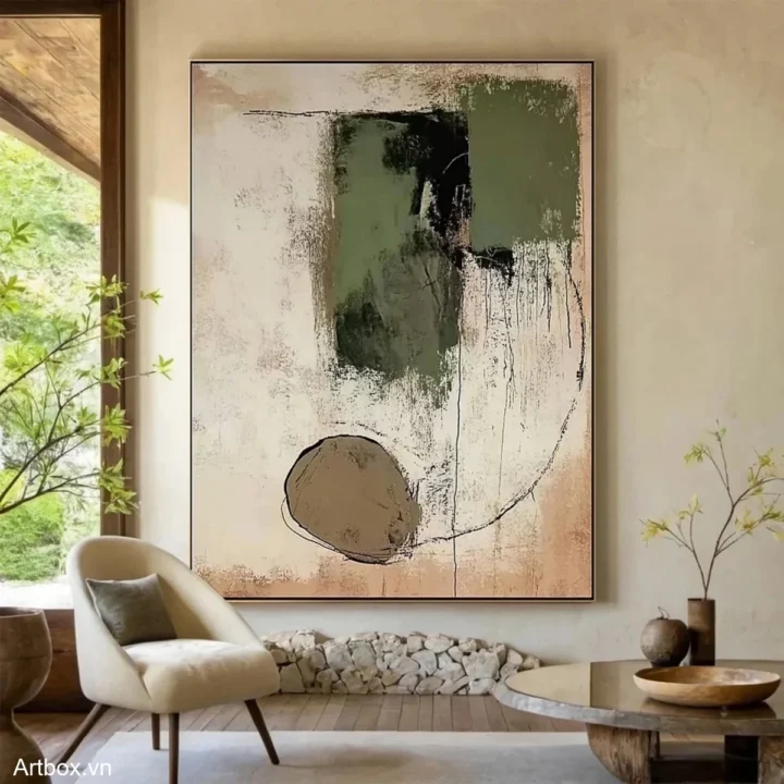 Bức tranh mang đến một cảm giác tĩnh lặng và thư thái với sự hòa quyện giữa các mảng màu xanh lá và nâu đất. Những đường nét đơn giản, nhưng đầy tinh tế, tạo nên sự cân bằng và hài hòa trong không gian. Các hình khối trừu tượng như gợi nhớ đến thiên nhiên, khiến người xem cảm nhận được sự bình yên và gần gũi. Kỹ thuật vẽ phẳng mang lại cảm giác hiện đại, nhẹ nhàng, tạo điểm nhấn cho bất kỳ không gian nào mà nó hiện diện. Sự kết hợp giữa màu sắc và hình khối tạo nên một tác phẩm nghệ thuật đầy cảm xúc và sức sống.