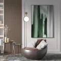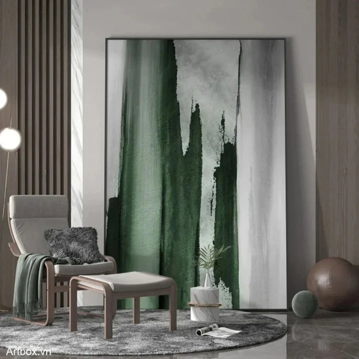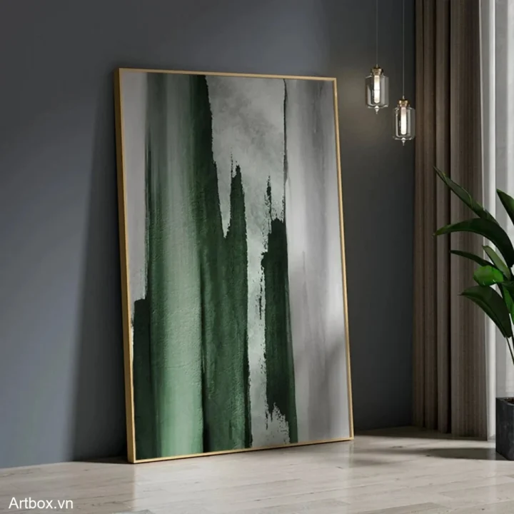 Bức tranh mang đến một cảm giác tươi mới và thanh bình với các sắc thái xanh lá cây mượt mà, hòa quyện với những gam màu xám nhẹ nhàng. Những đường nét mềm mại và mượt mà tạo nên một không gian trừu tượng, khơi gợi sự thư giãn và suy ngẫm. Kỹ thuật vẽ phẳng giúp làm nổi bật sự tinh tế và sự đơn giản, phù hợp cho những không gian hiện đại. Hình ảnh mang lại cảm giác nhẹ nhàng, như một làn gió mới, làm dịu đi sự ồn ào của cuộc sống thường nhật.