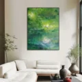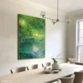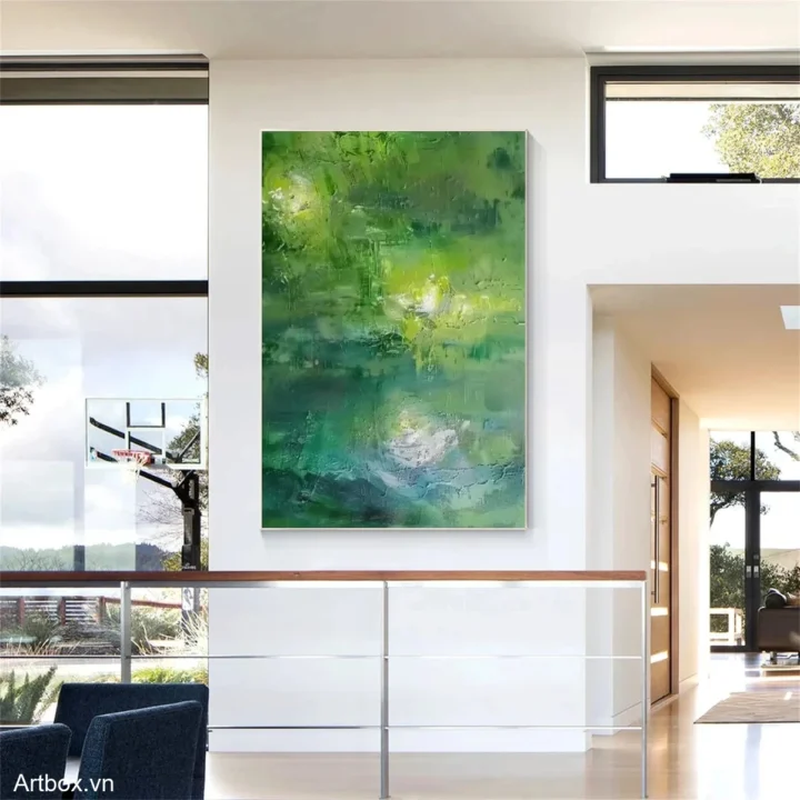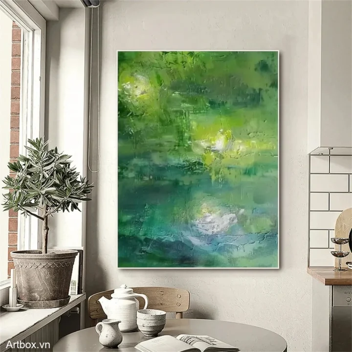 Bức tranh mang đến một cảm giác tươi mới và thanh bình với sự hòa quyện của các sắc thái xanh lá và xanh dương. Các lớp màu sắc được vẽ nổi tạo ra chiều sâu, khiến người xem như lạc vào một không gian thiên nhiên tràn đầy sức sống. Những đường nét mềm mại và sự chuyển giao màu sắc mượt mà gợi lên hình ảnh của một khu rừng tươi tốt hay mặt nước yên bình. Tác phẩm không chỉ là một điểm nhấn cho không gian sống mà còn mang lại cảm giác thư giãn, bình yên cho tâm hồn.