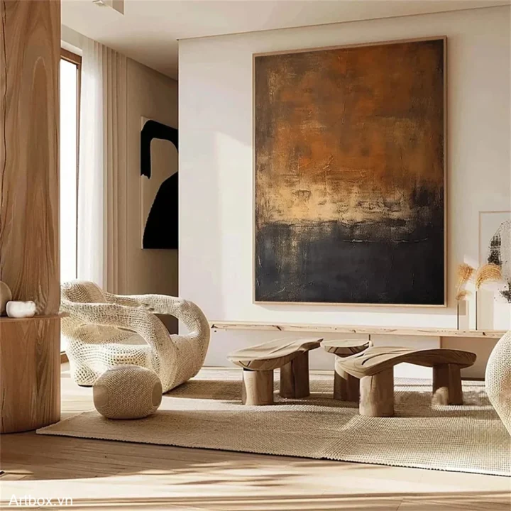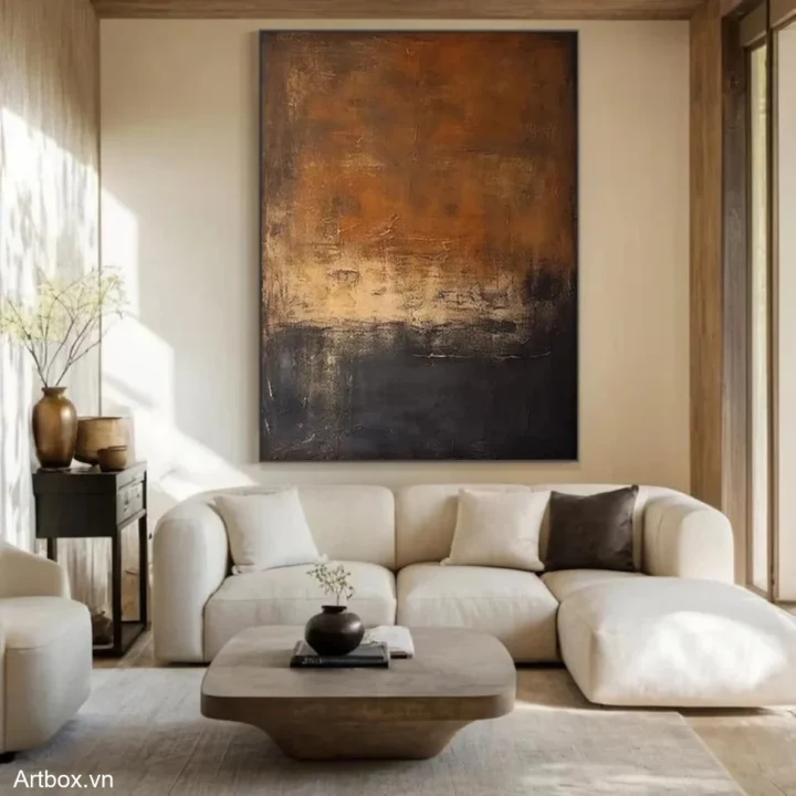 Bức tranh mang đến một không gian trừu tượng với sự kết hợp của các tông màu nâu be ấm áp, tạo cảm giác yên bình và gần gũi. Các lớp sơn được chồng lên nhau, tạo ra texture nổi, thể hiện chiều sâu và sự phong phú trong từng chi tiết. Hình ảnh như một bức tranh của bầu trời chiều, nơi ánh sáng và bóng tối giao thoa, mang lại cảm giác thư thái, giúp người xem dễ dàng chìm đắm trong những suy tư nhẹ nhàng. Đây là một tác phẩm nghệ thuật hoàn hảo cho không gian sống hiện đại, mang lại sự ấm cúng và dịu dàng.