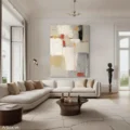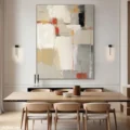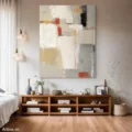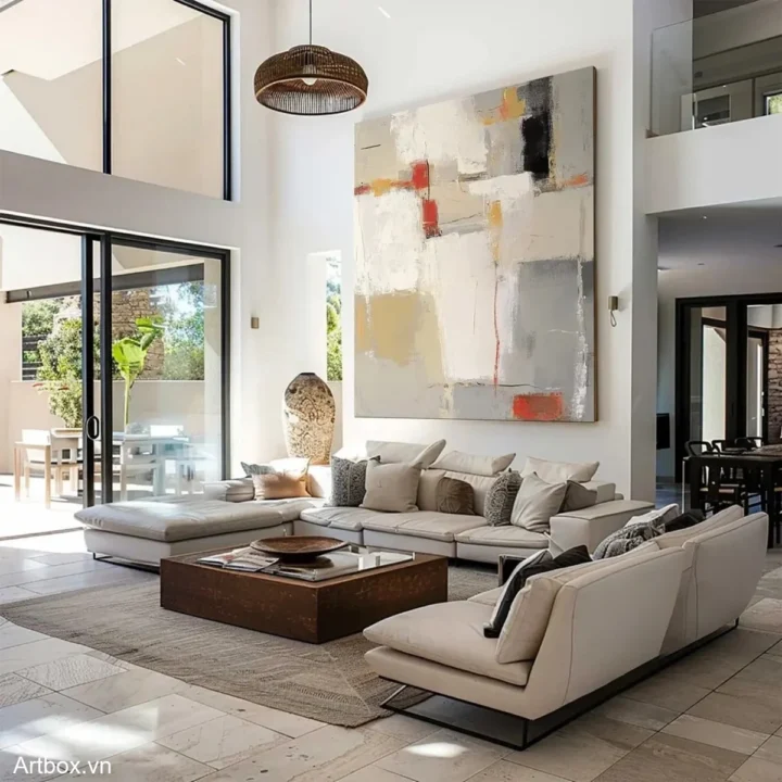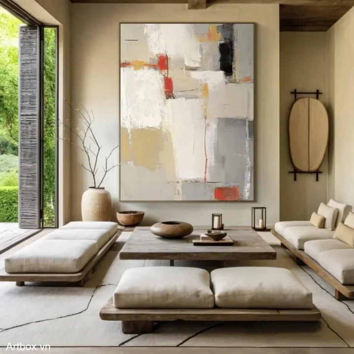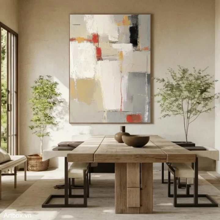 Bức tranh mang đến một không gian nghệ thuật đầy cảm xúc với những mảng màu sắc đa dạng, từ trắng sáng đến những tông màu ấm áp như vàng nhạt và đỏ cam. Các hình khối trừu tượng được sắp xếp một cách tinh tế, tạo nên sự hài hòa và cân đối. Kỹ thuật texture nổi làm nổi bật chiều sâu và sự sống động của bức tranh, khiến nó trở thành điểm nhấn trong không gian sống. Với phong cách hiện đại và tối giản, tác phẩm không chỉ thu hút ánh nhìn mà còn mang lại cảm giác thư giãn, nhẹ nhàng cho người xem.