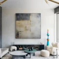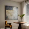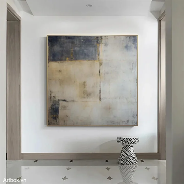 Bức tranh mang đến một cảm giác trừu tượng với sự kết hợp tinh tế giữa các tông màu sáng và tối. Những hình khối vuông vức, được sắp đặt một cách ngẫu hứng, tạo nên một bức tranh sống động nhưng vẫn giữ được sự thanh thoát. Màu sắc đa dạng hòa quyện, từ những sắc xám nhẹ nhàng đến những điểm nhấn màu vàng, tạo ra một không gian nghệ thuật đầy cảm xúc. Kỹ thuật vẽ phẳng giúp bức tranh trở nên hiện đại và dễ dàng hòa nhập vào bất kỳ không gian nào, mang lại sự thư giãn và tĩnh lặng cho người chiêm ngưỡng.