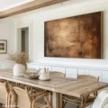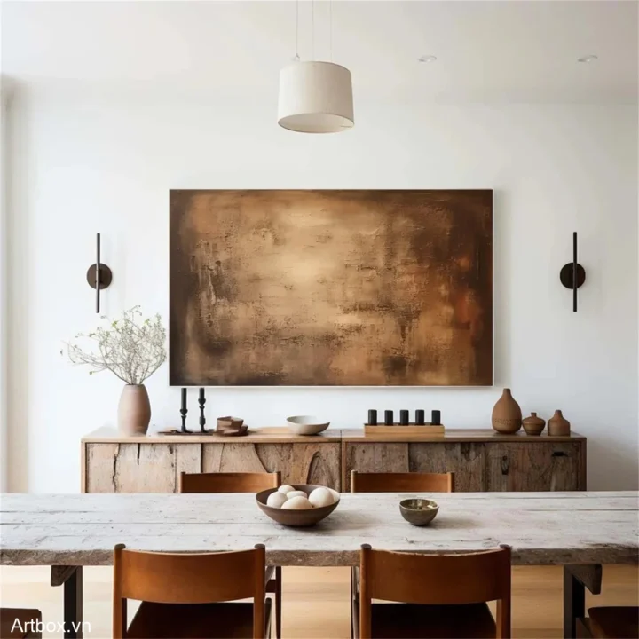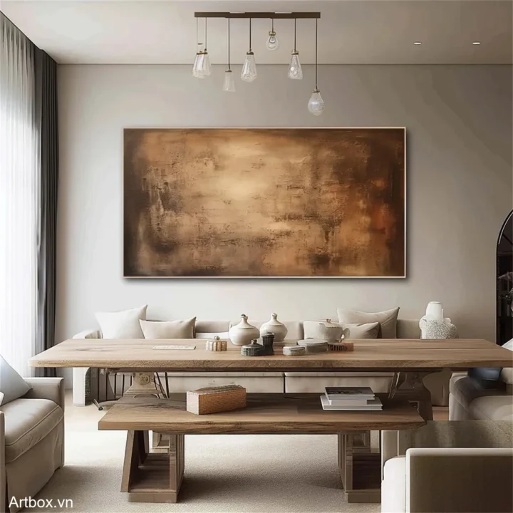 Bức tranh mang đến một không gian ấm áp với các tông màu nâu be nhẹ nhàng, hòa quyện với nhau một cách tinh tế. Những lớp màu được trải đều, tạo ra một bề mặt mịn màng, gợi cảm giác gần gũi và thư giãn. Hình ảnh trừu tượng không có hình khối cụ thể, nhưng lại khơi gợi sự tưởng tượng và cảm xúc của người xem. Bức tranh như một bức màn mờ ảo, mời gọi ánh nhìn khám phá chiều sâu và sắc thái của màu sắc, tạo nên một không gian nghệ thuật hiện đại và ấm cúng.