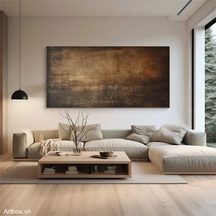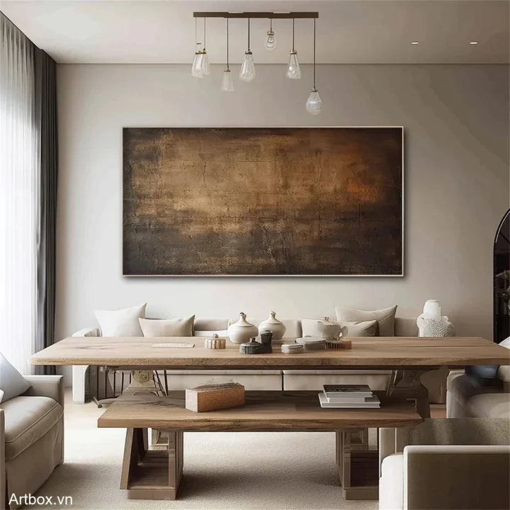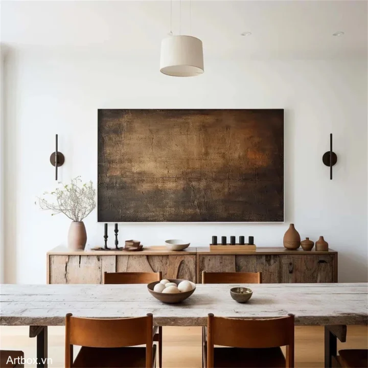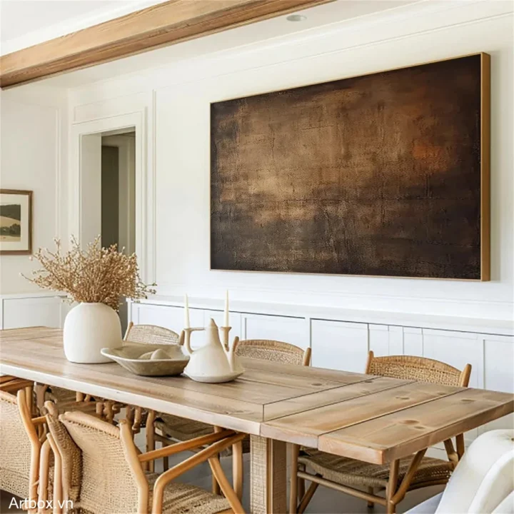 Bức tranh mang đến cảm giác sâu lắng và ấm áp với các tông màu nâu be hòa quyện. Sự kết hợp giữa texture nổi và độ mờ ảo tạo ra chiều sâu, như một bức tranh đất đai, gợi nhớ tới sự bình dị và gần gũi. Những đường nét mờ nhạt và sự chuyển giao màu sắc nhẹ nhàng tạo nên một không gian thư giãn, khiến người xem cảm thấy dễ chịu và an yên. Đây là một tác phẩm nghệ thuật lý tưởng cho không gian phòng ăn, nơi mọi người quây quần bên nhau.