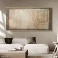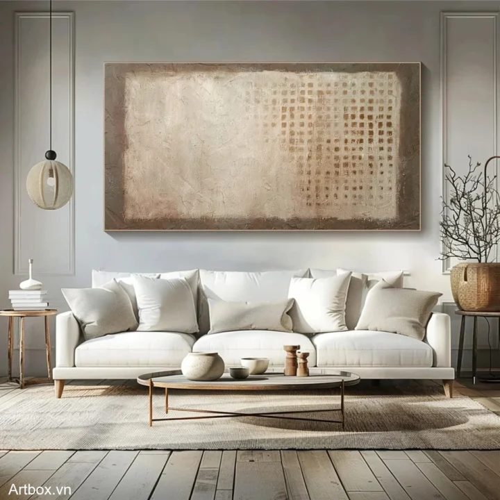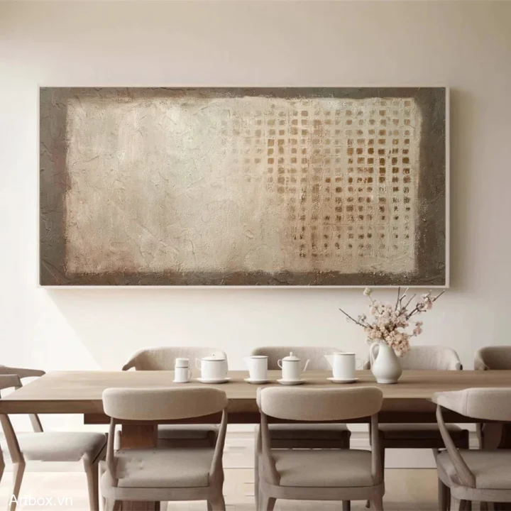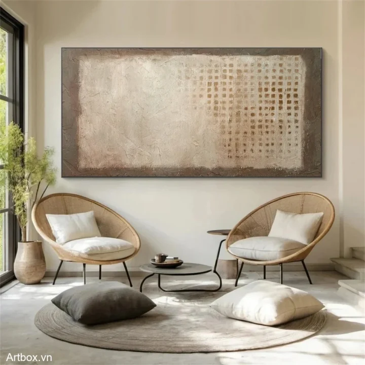 Bức tranh mang đến một cảm giác ấm áp và dịu nhẹ với tông màu nâu be chủ đạo. Các lớp sơn được áp dụng dày đặc tạo nên một bề mặt texture nổi, khiến người xem cảm nhận được chiều sâu và sự sống động của bức tranh. Hình ảnh trừu tượng với những hình khối đơn giản và đường nét mờ nhạt tạo nên sự thư giãn, giống như một khoảnh khắc bình yên trong thiên nhiên. Bức tranh không chỉ là một tác phẩm nghệ thuật mà còn là một phần của không gian sống, mang lại cảm giác gần gũi và ấm cúng cho người chiêm ngưỡng.