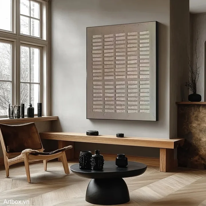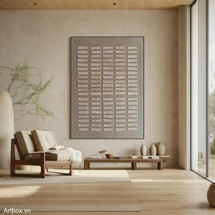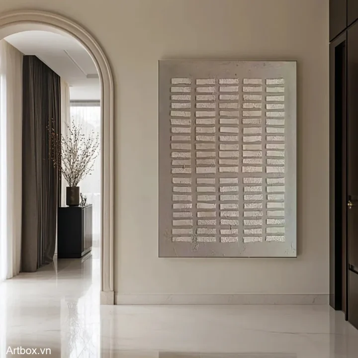 Bức tranh mang đến một cảm giác nhẹ nhàng và thanh thoát với các hình khối được sắp xếp một cách tối giản. Màu sắc pastel dịu nhẹ hòa quyện với nhau, tạo nên một bức nền tinh tế, làm nổi bật các đường nét nổi khối. Kỹ thuật texture nổi tạo chiều sâu cho bức tranh, khiến ánh sáng phản chiếu một cách mềm mại, tạo ra những hiệu ứng thú vị khi nhìn từ các góc độ khác nhau. Không gian xung quanh trở nên ấm cúng và gần gũi, khiến bức tranh trở thành điểm nhấn hoàn hảo cho không gian sống hiện đại.