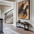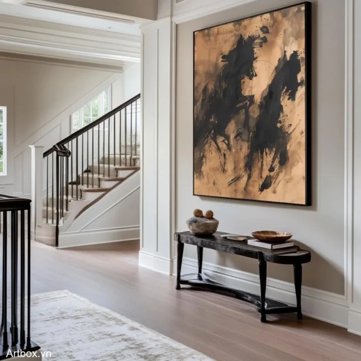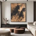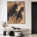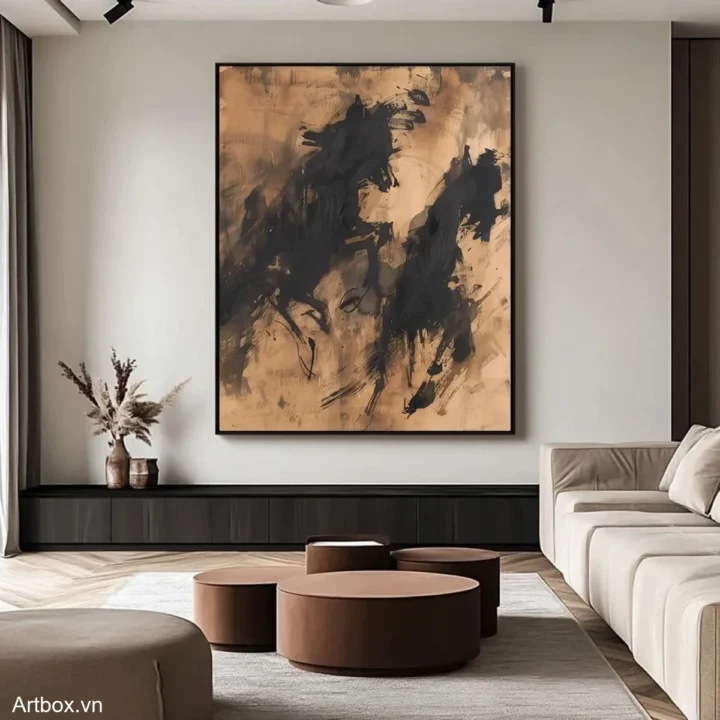 Bức tranh mang đến một cảm giác mạnh mẽ và đầy sức sống với những đường nét đen dày đặc, hòa quyện trên nền màu đất. Sự tương phản giữa màu đen và tông màu ấm của nền tạo ra một chiều sâu thú vị, khiến người xem bị cuốn hút vào sự bí ẩn của hình khối. Các nét vẽ tự do, không tuân theo quy tắc, như đang thể hiện một cuộc đối thoại giữa các yếu tố của tự nhiên, tạo ra một không gian trầm lắng nhưng cũng đầy năng lượng. Bức tranh không chỉ là một tác phẩm nghệ thuật mà còn là một trải nghiệm cảm xúc, mời gọi người xem khám phá và cảm nhận.