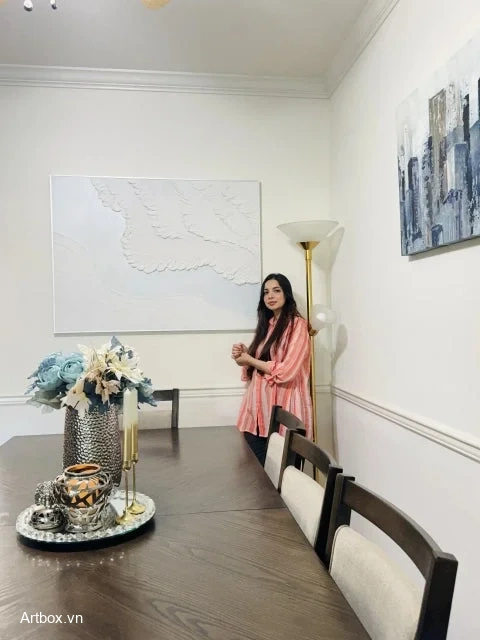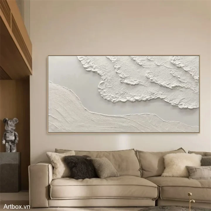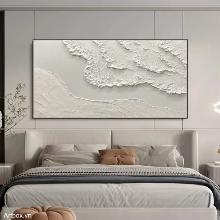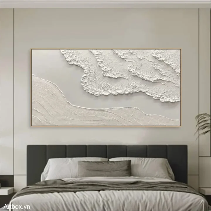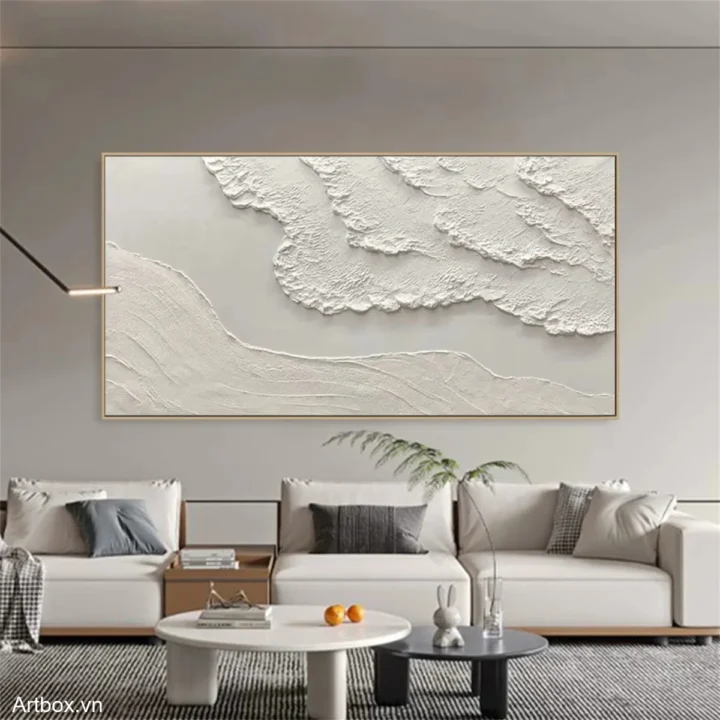 Bức tranh mang đến một cảm giác tinh tế và thanh lịch với những đường nét nổi bật, tạo ra chiều sâu và sự tương phản. Màu sắc chủ đạo là đen và trắng, thể hiện sự hòa quyện giữa ánh sáng và bóng tối. Các lớp texture nổi bật tạo nên sự sống động, khiến người xem cảm nhận được sự chuyển động và sự thăng hoa của nghệ thuật. Phong cách hiện đại và tối giản giúp bức tranh trở thành một điểm nhấn hoàn hảo trong không gian sống, mang lại cảm giác yên bình và thư giãn cho người thưởng thức.