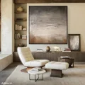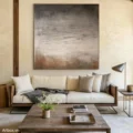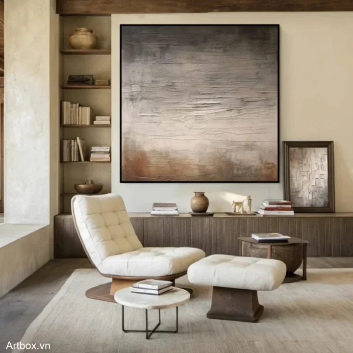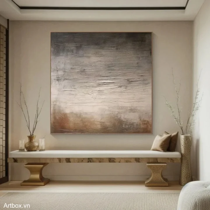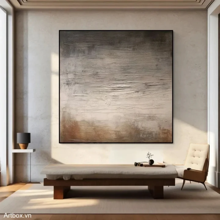 Bức tranh mang đến một cảm giác nhẹ nhàng và ấm áp với những tông màu nâu be tự nhiên, hòa quyện cùng các đường nét gợn sóng tạo nên chiều sâu. Kỹ thuật texture nổi khiến bề mặt tranh trở nên sống động, như thể hiện hơi thở của đất, tạo cảm giác gần gũi và thân thuộc. Bức tranh không chỉ là một tác phẩm nghệ thuật mà còn là một điểm nhấn trang trí đầy tinh tế, phù hợp cho không gian sống hiện đại. Từ xa, ánh sáng nhẹ nhàng chiếu rọi lên bức tranh, làm nổi bật những sắc thái và chi tiết tinh tế, mang lại cảm giác thư giãn và yên bình cho người ngắm nhìn.
