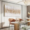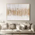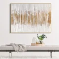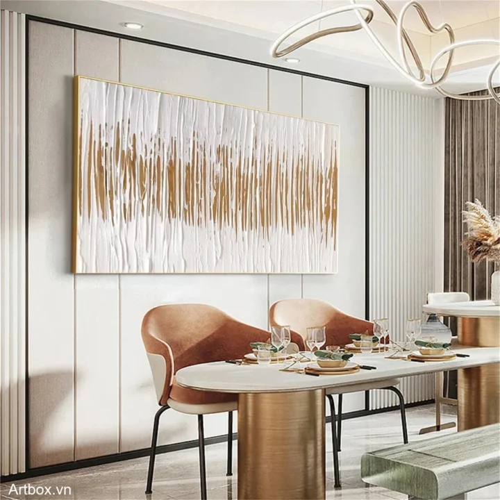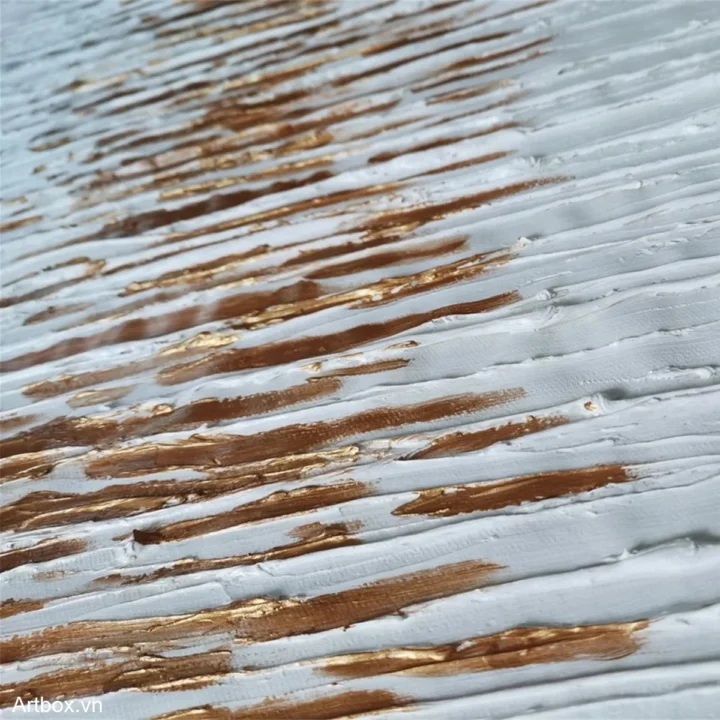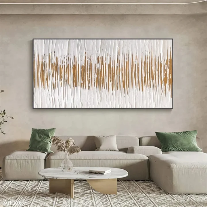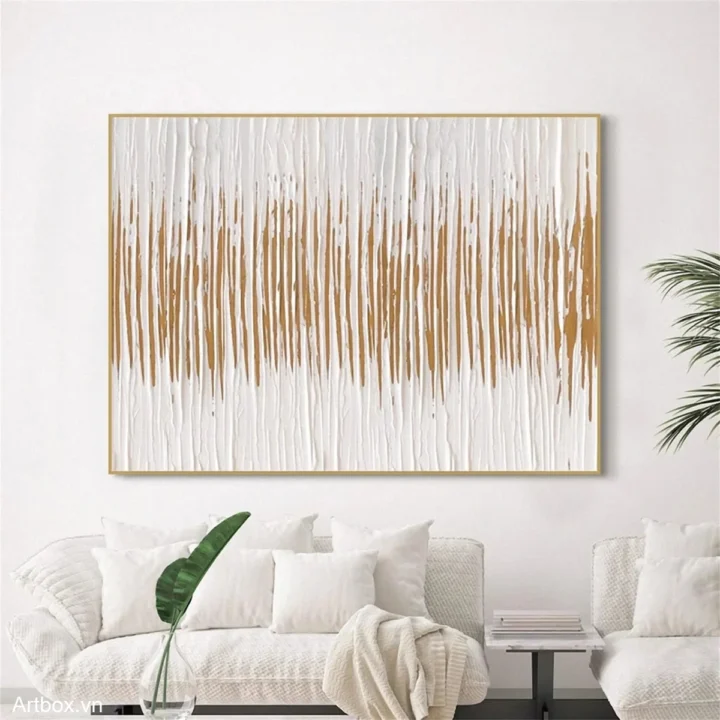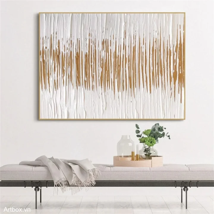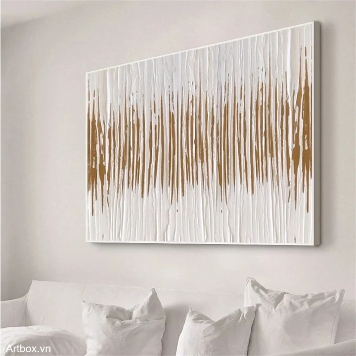 Bức tranh mang đến cảm giác nhẹ nhàng và ấm cúng với những đường nét nổi bật, thể hiện sự hòa quyện giữa màu nâu be ấm áp và nền trắng tinh khôi. Các họa tiết được tạo ra từ kỹ thuật texture nổi, tạo chiều sâu và sự sống động cho tác phẩm. Hình ảnh trừu tượng với các đường thẳng dọc, gợi nhớ đến hình ảnh của những cánh đồng hay những lớp đất, mang lại cảm giác gần gũi với thiên nhiên. Tác phẩm này không chỉ là một điểm nhấn nghệ thuật mà còn là một nguồn cảm hứng cho không gian sống hiện đại và thanh thoát.