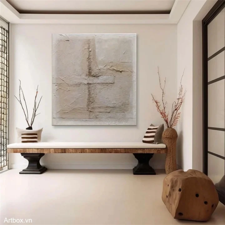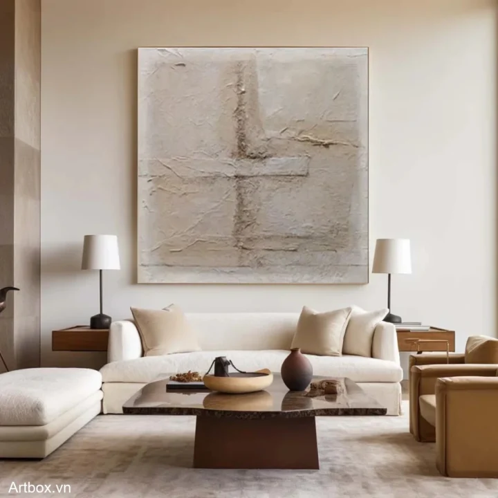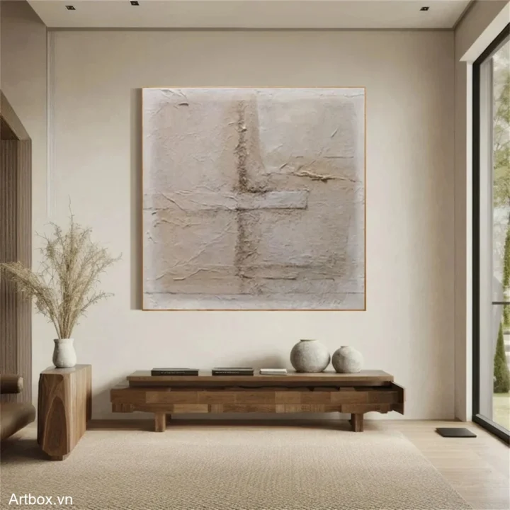 Bức tranh mang đến cảm giác nhẹ nhàng và ấm áp, với các lớp màu nâu be hòa quyện tạo nên chiều sâu và kết cấu thú vị. Những đường nét trừu tượng, không rõ ràng, như một hơi thở của đất, gợi mở nhiều cảm xúc và suy tư. Kỹ thuật texture nổi giúp bức tranh trở nên sống động, mời gọi người xem khám phá từng chi tiết. Phong cách hiện đại và tối giản thể hiện sự tinh tế, phù hợp với không gian sống hiện đại, tạo cảm giác bình yên và thư giãn cho người thưởng thức.