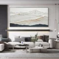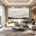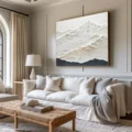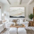Bức tranh mang đến một cảm giác yên bình và thư thái, với những đường nét uốn lượn của núi non được thể hiện qua kỹ thuật texture nổi. Màu trắng chủ đạo cùng với những sắc độ nhẹ nhàng tạo nên một không gian thanh thoát, tinh tế. Hình khối mềm mại, kết hợp với sự tương phản giữa các lớp màu, gợi lên hình ảnh của những ngọn núi trong sương mù, mang lại cảm giác sâu lắng và suy tư. Đây là một tác phẩm nghệ thuật hiện đại, phù hợp cho không gian sống và làm việc, giúp khơi gợi cảm hứng và sự sáng tạo.