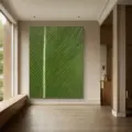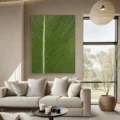 Bức tranh mang đến một cái nhìn gần gũi với thiên nhiên qua hình ảnh một chiếc lá lớn, thể hiện sự tươi mát và sức sống. Màu xanh lá chủ đạo không chỉ tạo cảm giác thư giãn mà còn làm nổi bật chi tiết của các gân lá, tạo nên chiều sâu và texture sống động. Kỹ thuật vẽ nổi giúp bức tranh trở nên gần gũi và chân thực, như thể bạn có thể chạm vào bề mặt lá. Phong cách hiện đại kết hợp với yếu tố Wabi-Sabi mang lại một vẻ đẹp tự nhiên, không hoàn hảo nhưng đầy sức hấp dẫn, phù hợp cho những không gian sống hiện đại, mang lại cảm giác ấm cúng và dịu nhẹ.