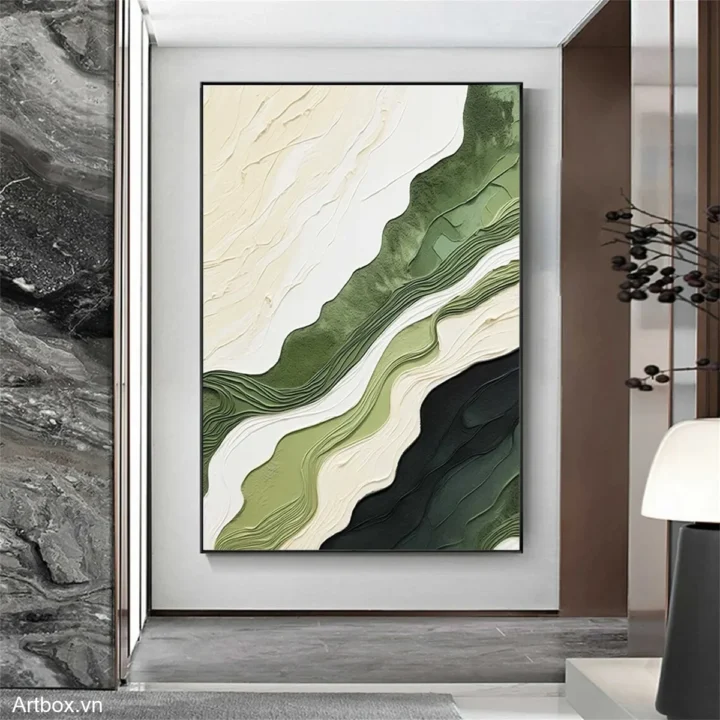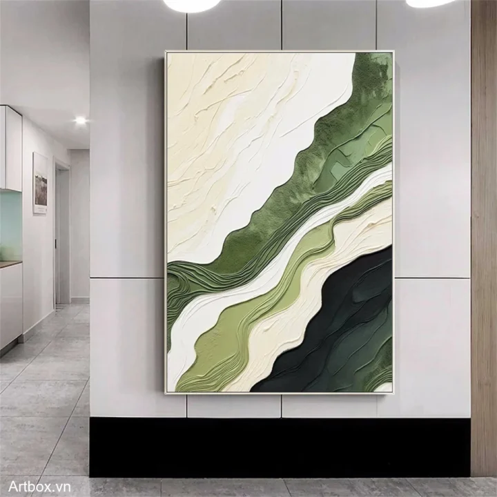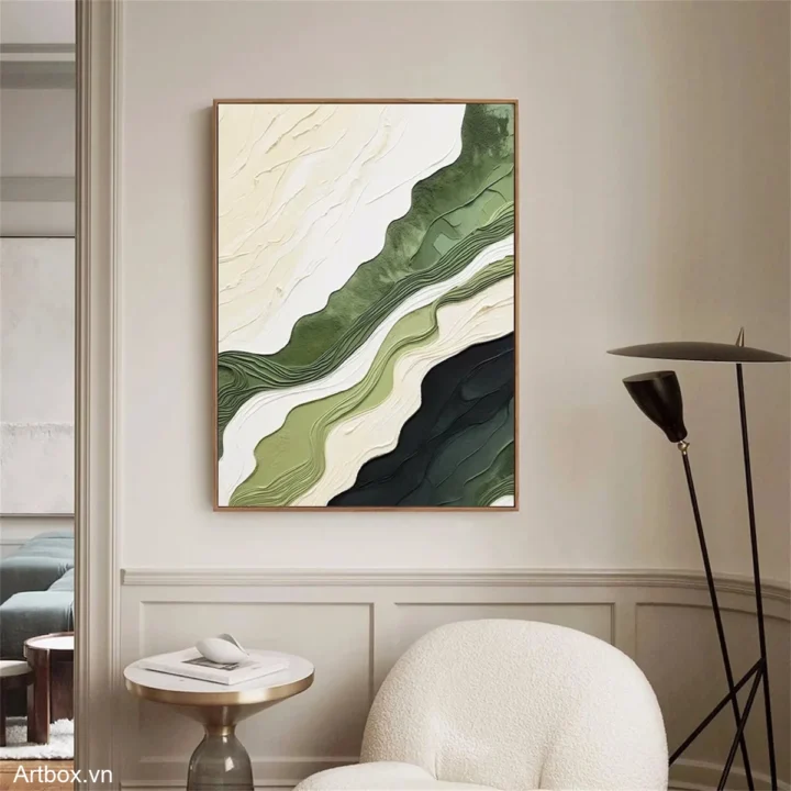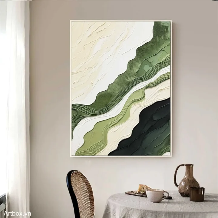 Bức tranh mang đến một cảm giác thư thái và gần gũi với thiên nhiên. Những đường nét uốn lượn mềm mại, kết hợp giữa các tông màu xanh lá cây và trắng, tạo nên một không gian thanh bình và dễ chịu. Kỹ thuật texture nổi làm nổi bật chiều sâu của bức tranh, khiến nó trở nên sống động hơn. Những lớp màu chồng lên nhau không chỉ tạo ra sự tương phản mà còn gợi lên hình ảnh của những ngọn đồi xanh mướt, mang lại cảm giác bình yên và ấm áp cho người ngắm. Đây là một tác phẩm nghệ thuật lý tưởng cho những không gian hiện đại, nơi mà sự tối giản và cảm xúc hòa quyện.