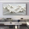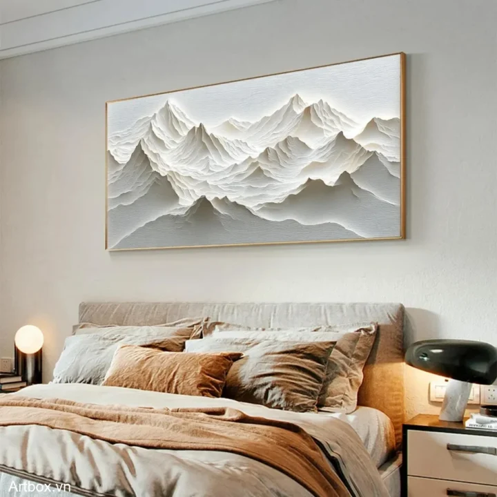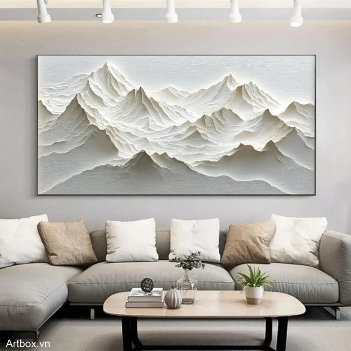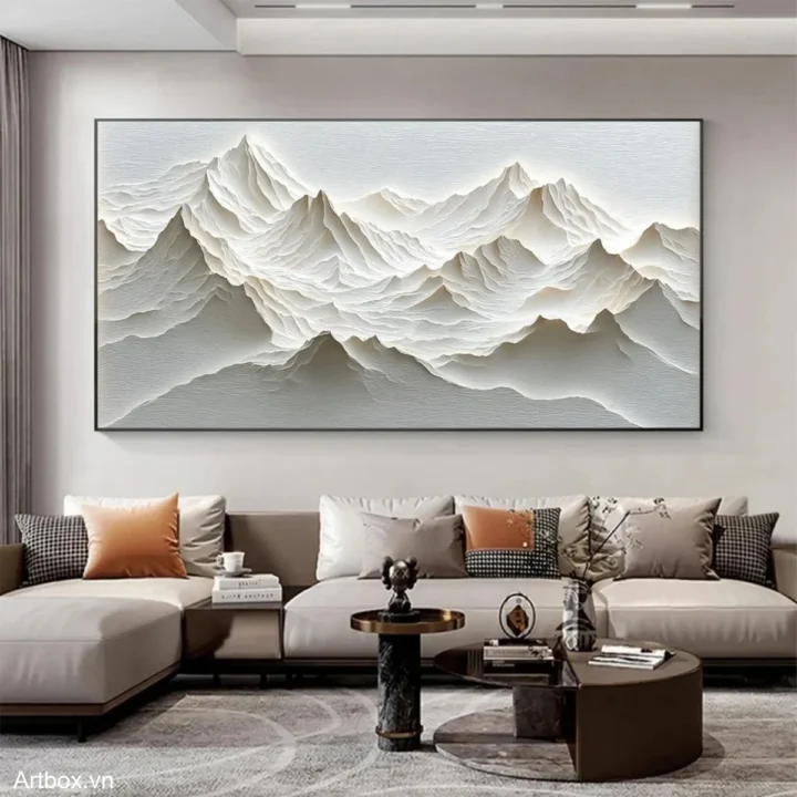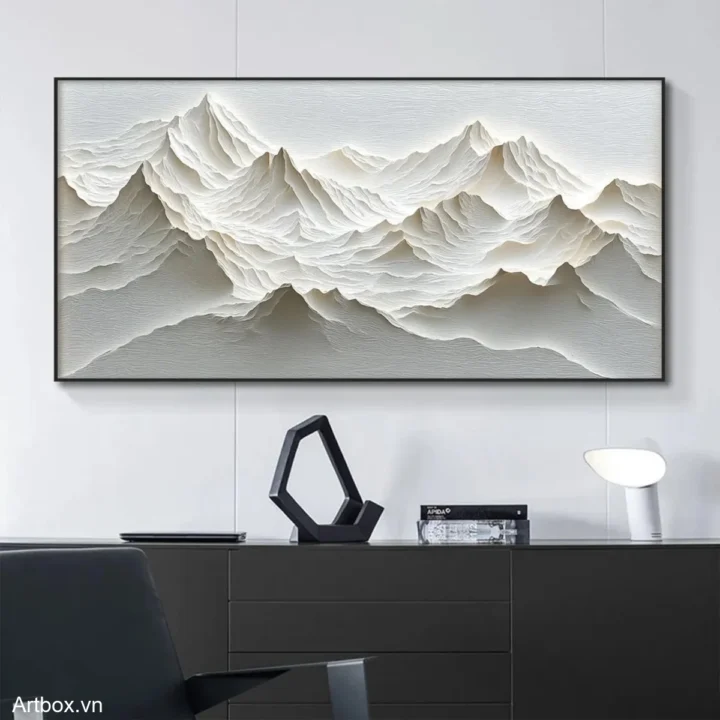 Bức tranh khắc họa một khung cảnh núi non hùng vĩ với những đường nét uốn lượn, tạo nên chiều sâu và sự sống động. Màu xám nhẹ nhàng, kết hợp với kỹ thuật texture nổi, mang lại cảm giác gần gũi và thư giãn. Những đỉnh núi nhấp nhô như đang thì thầm câu chuyện của thiên nhiên, mời gọi người xem hòa mình vào vẻ đẹp thanh bình. Từng lớp sóng của đất trời được thể hiện tinh tế, tạo nên một không gian yên tĩnh, trầm lắng, thích hợp cho những khoảnh khắc suy tư trong cuộc sống thường nhật.