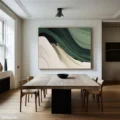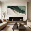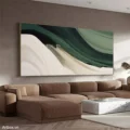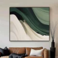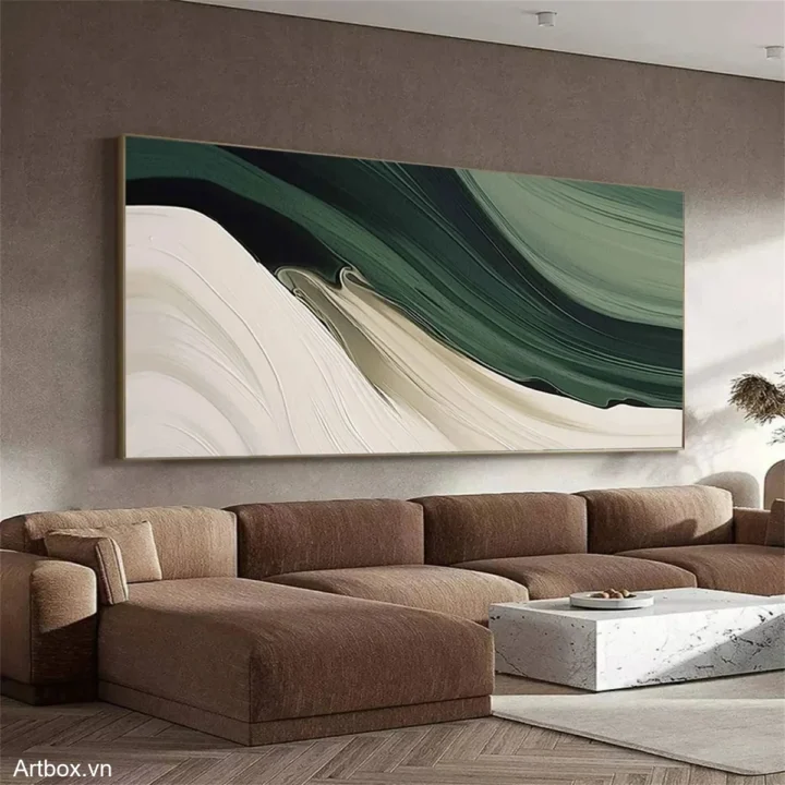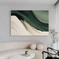 Bức tranh mang đến một không gian thư giãn với những đường nét mềm mại, uyển chuyển, thể hiện sự hòa quyện giữa màu xanh lá và trắng. Các lớp màu chồng lên nhau tạo nên chiều sâu và sự sống động, như làn sóng nhẹ nhàng vỗ về tâm hồn. Sự đơn giản trong thiết kế không chỉ tôn vinh vẻ đẹp tự nhiên mà còn mang lại cảm giác bình yên, nhẹ nhàng cho không gian xung quanh. Màu sắc tươi sáng và cách thể hiện tinh tế làm nổi bật sự hiện đại, phù hợp với những không gian sống hiện đại và sang trọng.