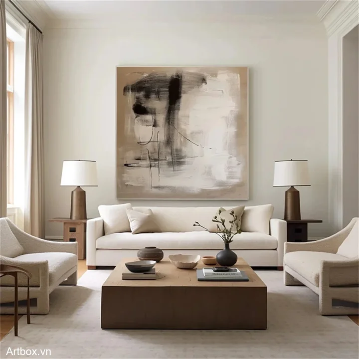 Bức tranh mang đến một không gian tĩnh lặng và sâu lắng với những đường nét đơn giản, mạnh mẽ nhưng không kém phần tinh tế. Tông màu đen trắng hòa quyện tạo nên sự tương phản nổi bật, gợi mở những cảm xúc trầm lắng và dịu nhẹ. Các hình khối trừu tượng như đang thì thầm những câu chuyện chưa kể, khơi gợi trí tưởng tượng của người xem. Kỹ thuật vẽ phẳng giúp bức tranh trở nên hiện đại và dễ dàng hòa hợp với nhiều không gian khác nhau, từ phòng khách đến phòng làm việc, tạo nên một điểm nhấn nghệ thuật độc đáo.