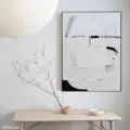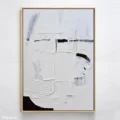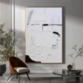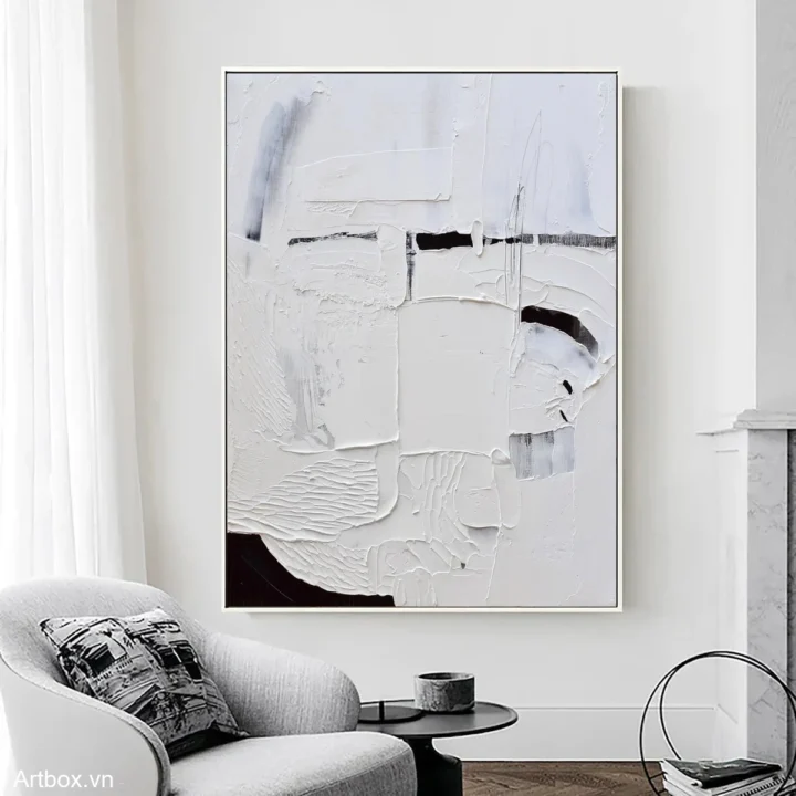 Bức tranh mang đến một không gian trừu tượng với sự kết hợp tinh tế giữa các sắc thái trắng và đen. Những đường nét mềm mại, cùng với kết cấu nổi bật, tạo ra một cảm giác chiều sâu và sự chuyển động. Các lớp sơn được chồng lên nhau, tạo nên một bề mặt phong phú mà người xem có thể cảm nhận được sự sống động và năng lượng. Sự đơn giản trong màu sắc nhưng lại đầy sức hút, khiến bức tranh trở thành một điểm nhấn nổi bật trong không gian, đồng thời mang lại cảm giác dịu nhẹ và thư giãn cho người xem.