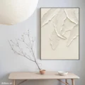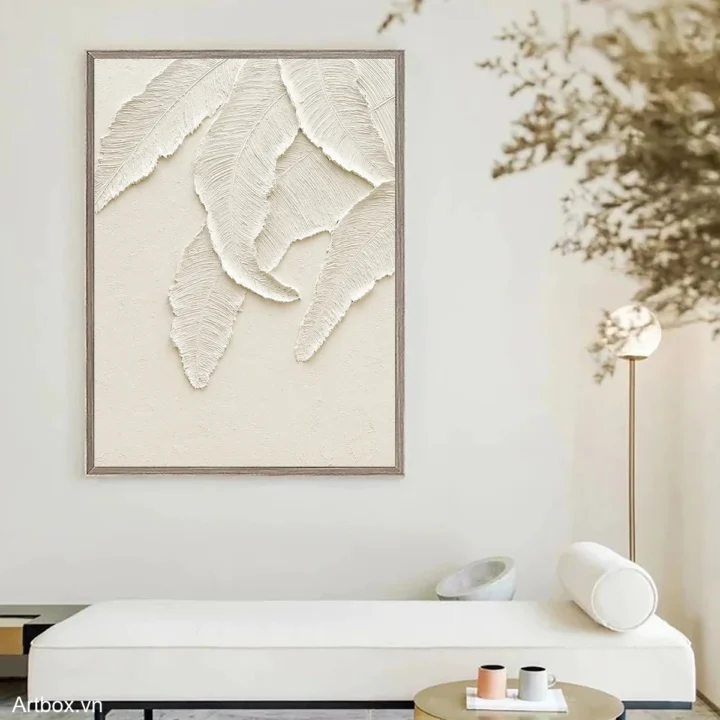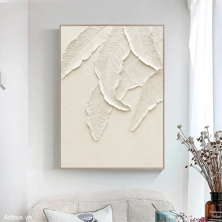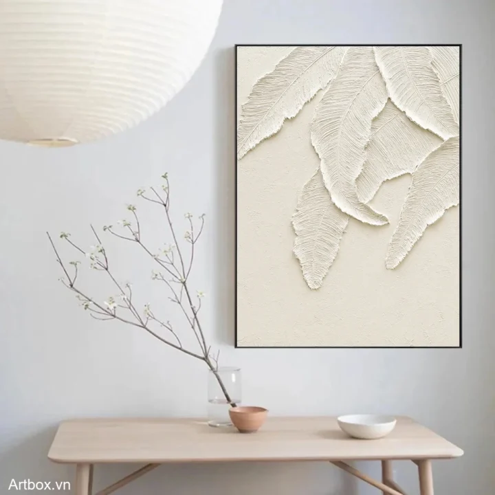 Bức tranh mang đến một cảm giác gần gũi và thư thái, với những chiếc lá được thể hiện bằng kỹ thuật texture nổi, tạo chiều sâu và sự sống động. Màu nâu be dịu nhẹ kết hợp với hình dáng tự nhiên của lá cây, mang lại sự tươi mát và thanh bình. Các chi tiết tinh tế của lá được khắc họa một cách nghệ thuật, thể hiện vẻ đẹp giản dị nhưng đầy cuốn hút. Không gian xung quanh trở nên ấm áp và thân thuộc hơn, khiến bức tranh trở thành điểm nhấn hoàn hảo cho những không gian sống hiện đại và thanh lịch.
