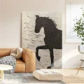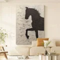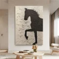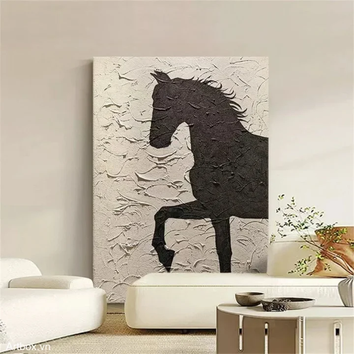 Bức tranh khắc họa hình ảnh một con ngựa với dáng vẻ kiêu hãnh và mạnh mẽ, được thể hiện qua kỹ thuật texture nổi. Gam màu đen trắng tạo nên sự tương phản mạnh mẽ, mang lại cảm giác vừa mạnh mẽ vừa dịu nhẹ. Hình ảnh ngựa đứng trên hai chân sau, như đang chuẩn bị nhảy, gợi lên sự tự do và năng động. Bề mặt tranh được xử lý tinh tế, tạo chiều sâu và cảm giác sống động, khiến người xem cảm nhận được sức sống mãnh liệt của hình thể. Đây là tác phẩm lý tưởng cho không gian hiện đại, mang lại sự ấn tượng và phong cách cho ngôi nhà.