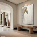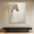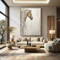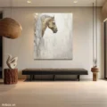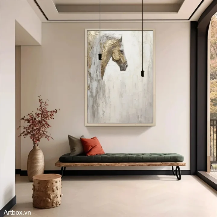 Bức tranh thể hiện hình ảnh một chú ngựa với sắc thái tinh tế, nổi bật giữa nền tông màu nhẹ nhàng. Đường nét mềm mại và chi tiết của bộ lông ngựa được thể hiện qua kỹ thuật texture nổi, tạo cảm giác sống động và gần gũi. Màu sắc đa dạng từ vàng nhạt đến nâu ấm, mang đến sự ấm áp và dịu dàng cho không gian. Tác phẩm không chỉ là biểu tượng của sức mạnh và sự tự do mà còn gợi lên cảm xúc bình yên, lý tưởng cho những không gian thư giãn như phòng khách hoặc phòng ngủ.