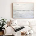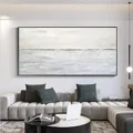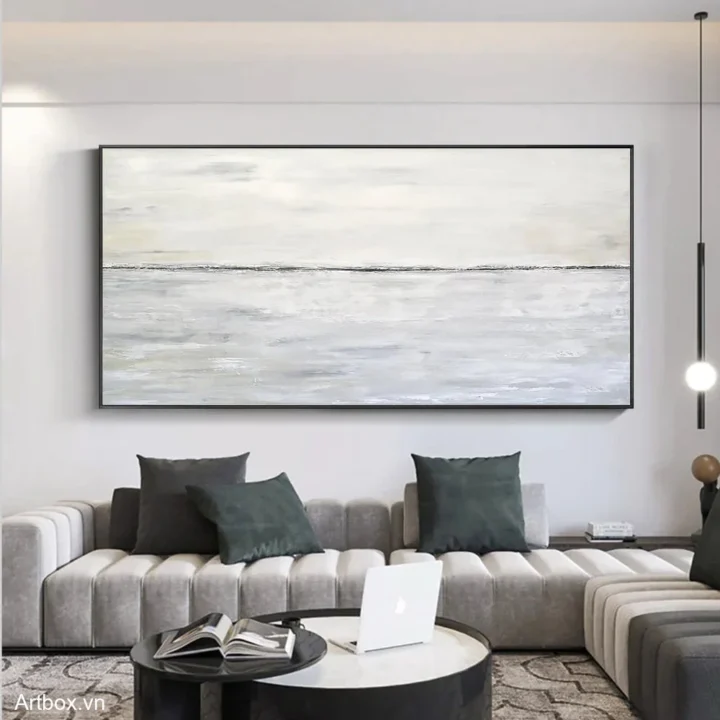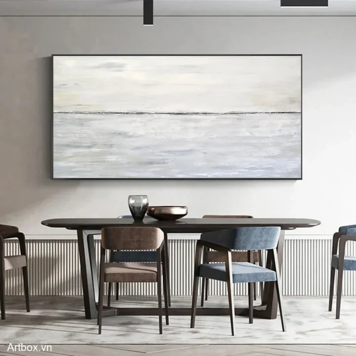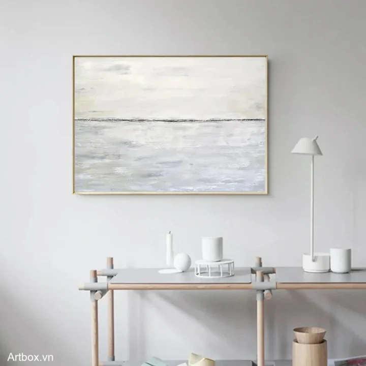 Bức tranh mang đến một cảm giác bình yên với gam màu xám nhẹ nhàng, tạo nên một không gian thư giãn. Hình ảnh chân trời mờ ảo, nơi nước và trời hòa quyện vào nhau, gợi lên sự tĩnh lặng và thanh thản. Các lớp màu sắc được vẽ mịn màng, không có sự phân chia rõ ràng, như một bức tranh thiên nhiên vô tận. Kỹ thuật vẽ phẳng mang lại sự hiện đại và tối giản, thích hợp cho những ai yêu thích sự thanh thoát trong nghệ thuật. Bức tranh như một lời mời gọi đến sự bình yên trong tâm hồn, phù hợp cho không gian sống hiện đại.