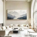 Bức tranh mang đến một khung cảnh núi non hùng vĩ, với những dãy núi cao vút được thể hiện bằng các lớp sơn nổi, tạo cảm giác chiều sâu và sự sống động. Màu xám chủ đạo hòa quyện với sắc thái nhẹ nhàng, tạo nên một không gian tĩnh lặng và thư thái. Những đường nét mềm mại và mạnh mẽ của cảnh vật gợi lên sự kỳ vĩ của thiên nhiên, khiến người xem cảm thấy như đang đứng trước một bức tranh thực sự. Tác phẩm này không chỉ là một phần của không gian sống mà còn là một tác phẩm nghệ thuật đầy cảm xúc, mang lại sự bình yên và sâu lắng cho tâm hồn.
