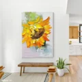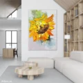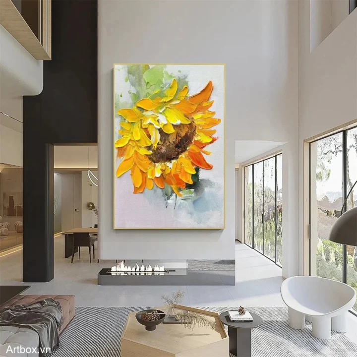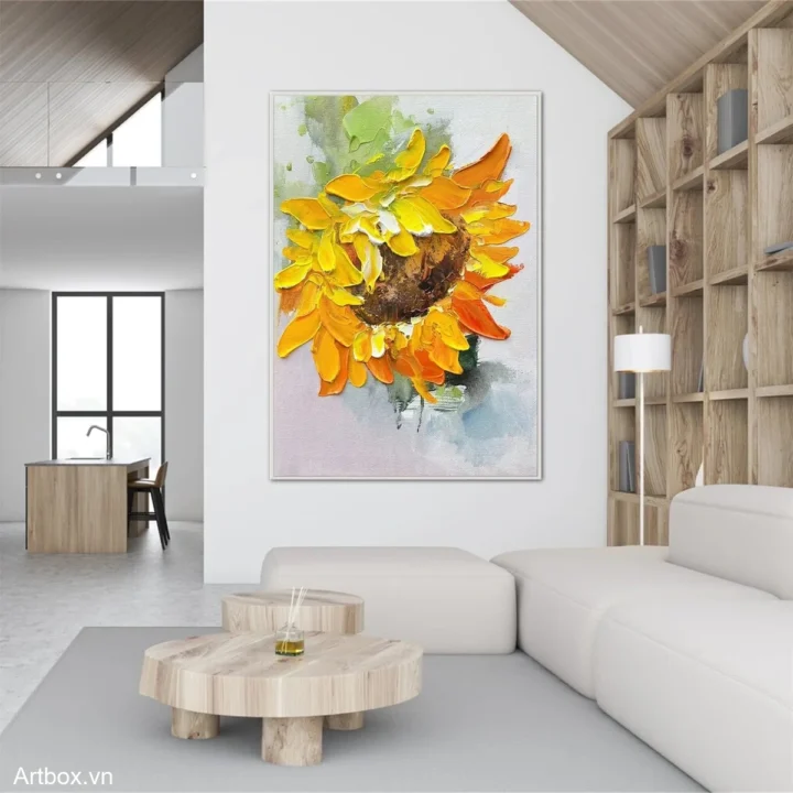 Bức tranh mang đến hình ảnh một bông hoa hướng dương rực rỡ, với những cánh hoa vàng tươi sáng, thể hiện sức sống mãnh liệt và niềm vui. Kỹ thuật texture nổi được sử dụng để tạo chiều sâu và cảm giác sống động, khiến bông hoa như đang nở rộ trước mắt người xem. Nền tranh nhẹ nhàng, với các sắc thái màu pastel, tạo nên một không gian hài hòa và thư giãn. Bức tranh không chỉ là một tác phẩm nghệ thuật mà còn là một nguồn cảm hứng, mang lại cảm giác ấm áp và vui tươi cho không gian sống.