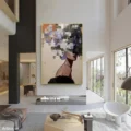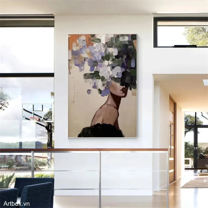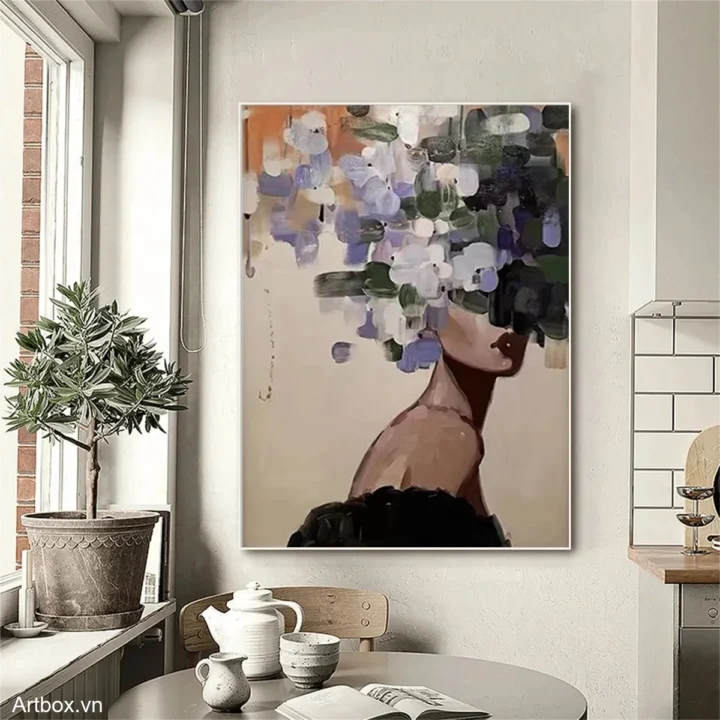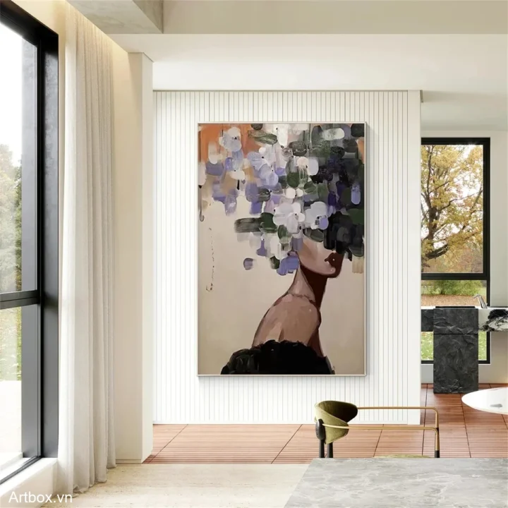 Bức tranh thể hiện hình ảnh một người phụ nữ với khuôn mặt được che phủ bởi những bông hoa rực rỡ. Sự kết hợp giữa các màu sắc tươi sáng như xanh lá, tím và trắng tạo nên một cảm giác hài hòa và sống động. Kỹ thuật vẽ phẳng mang lại sự tinh tế và hiện đại, làm nổi bật hình thể của nhân vật mà không làm mất đi tính nghệ thuật. Bức tranh không chỉ là một tác phẩm nghệ thuật mà còn là một biểu tượng của sự kết nối giữa con người và thiên nhiên, mang lại cảm giác dịu nhẹ và ấm cúng cho không gian sống. Sự đơn giản trong phong cách giúp bức tranh dễ dàng hòa nhập với nhiều không gian khác nhau.