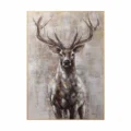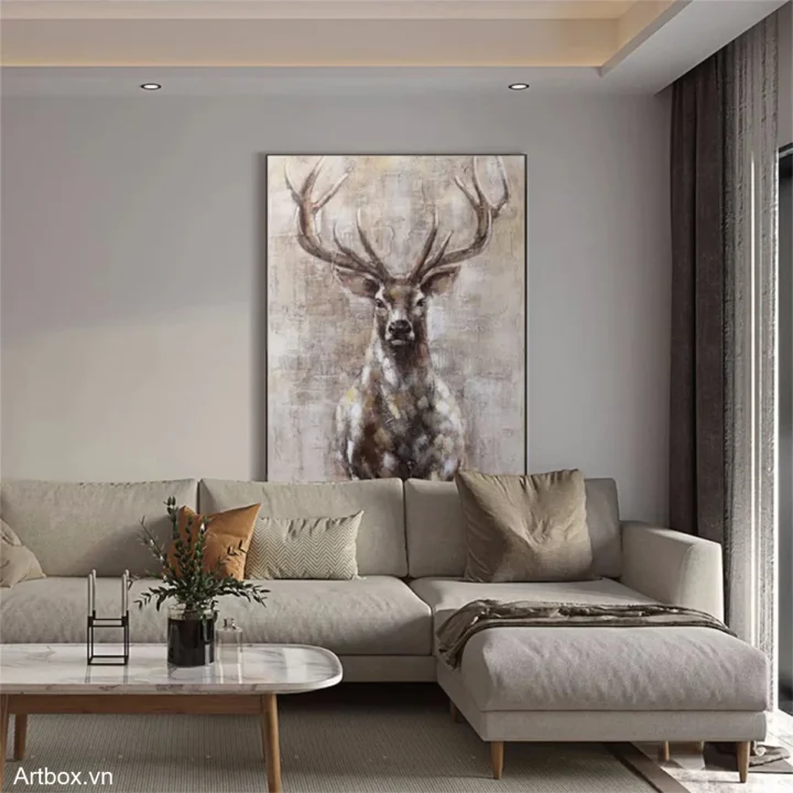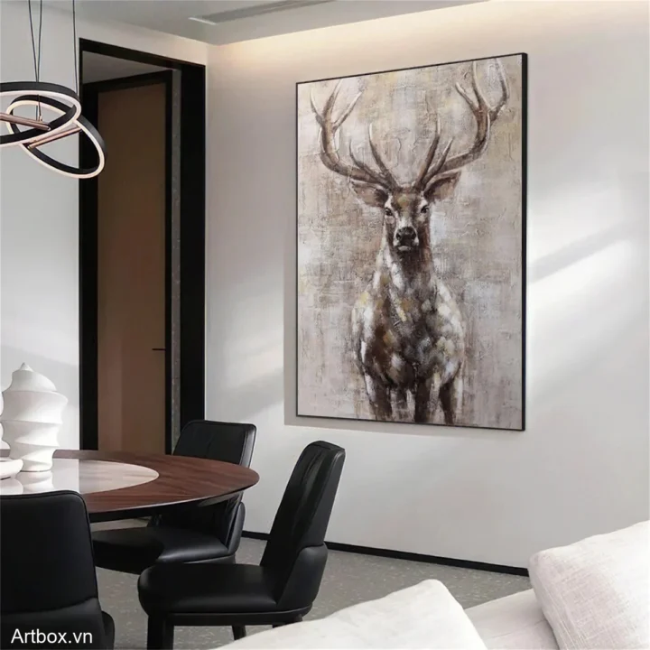 Bức tranh khắc họa hình ảnh một con hươu với bộ lông nâu be ấm áp, nổi bật trên nền màu sắc nhẹ nhàng. Đường nét của nó thể hiện sự mạnh mẽ và thanh thoát, trong khi những chi tiết tinh tế tạo cảm giác gần gũi và thân thuộc. Hươu đứng thẳng, đôi mắt tràn đầy sự bình tĩnh, như đang lắng nghe nhịp sống xung quanh. Kỹ thuật texture nổi làm tăng thêm chiều sâu cho tác phẩm, mang lại cảm giác sống động, gần gũi với thiên nhiên. Bức tranh không chỉ là một tác phẩm nghệ thuật, mà còn là một phần không gian sống, tạo nên cảm giác ấm cúng và thư giãn.