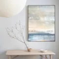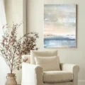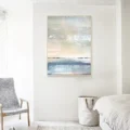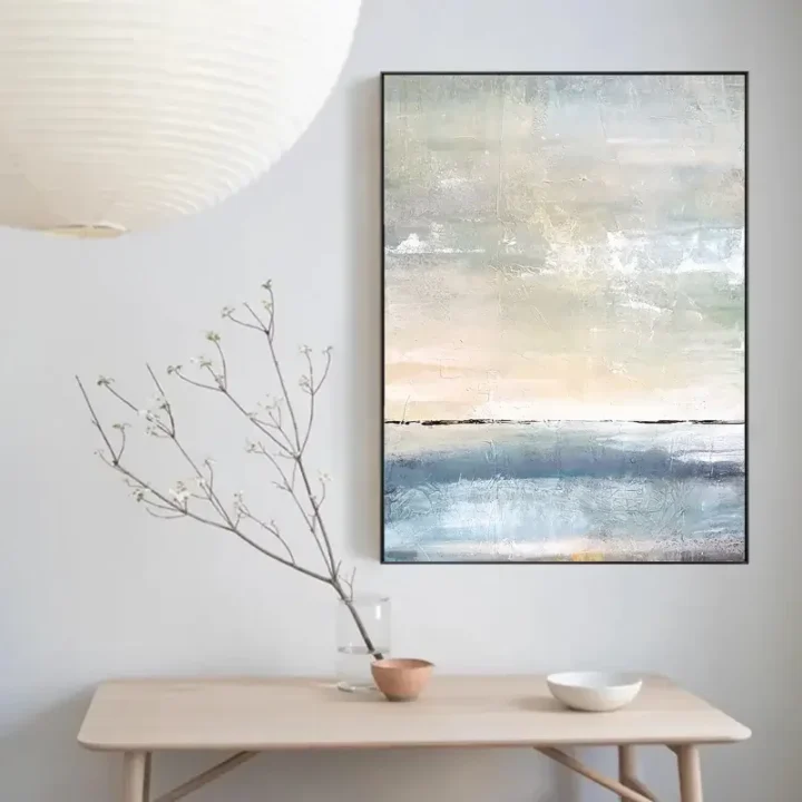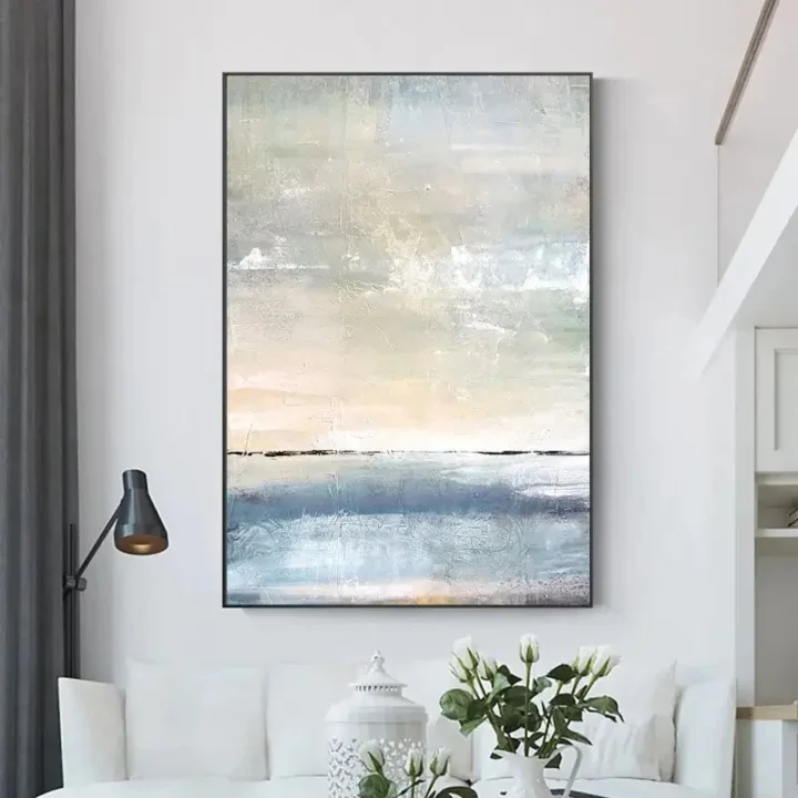 Bức tranh mang đến một không gian yên bình với những sắc thái nhẹ nhàng của màu xanh da trời và những gam màu pastel. Hình ảnh mờ ảo gợi lên cảm giác về một buổi bình minh hoặc hoàng hôn, nơi ánh sáng và bóng tối giao thoa. Các lớp màu sắc được áp dụng một cách tinh tế, tạo nên chiều sâu và sự chuyển động nhẹ nhàng, như làn sóng vỗ về. Kỹ thuật texture nổi làm cho bức tranh trở nên sống động, mang lại cảm giác gần gũi và thư giãn. Đây là tác phẩm lý tưởng cho không gian sống, giúp tâm hồn trở nên thanh thản và dễ chịu.
