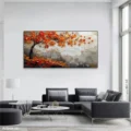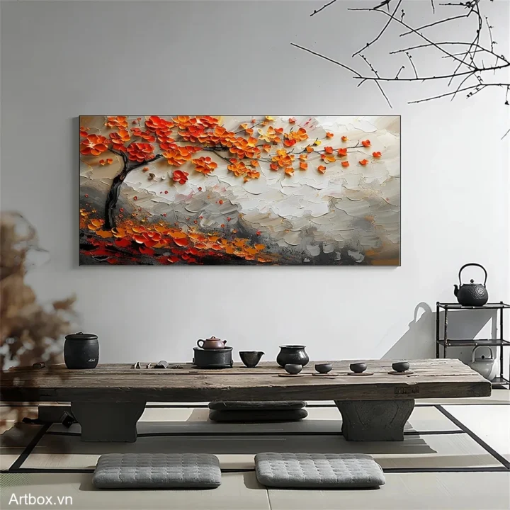 Bức tranh mang đến một cảm giác tươi mới và sống động với những chiếc lá đỏ rực rỡ, nổi bật trên nền màu sáng. Các chi tiết được thể hiện qua kỹ thuật texture nổi, tạo chiều sâu và sự phong phú cho bức tranh. Hình ảnh cây cối như hòa quyện với ánh sáng, mang lại cảm giác ấm áp và gần gũi. Màu đỏ tươi sáng không chỉ thu hút ánh nhìn mà còn truyền tải năng lượng tích cực, phù hợp cho những không gian sống hiện đại. Sự kết hợp giữa màu sắc và hình khối tạo nên một tác phẩm nghệ thuật đầy sức sống và cảm hứng.