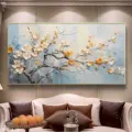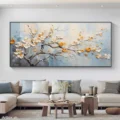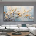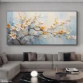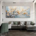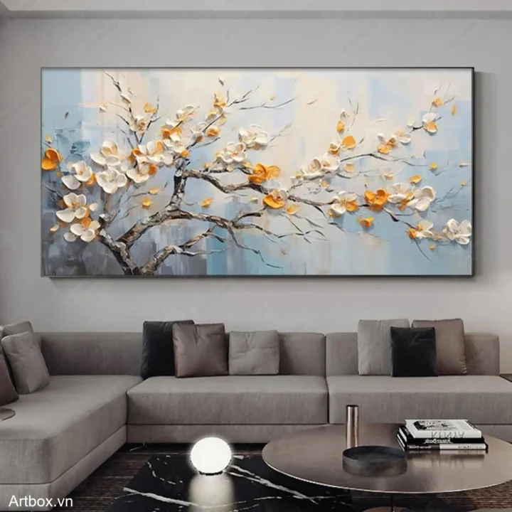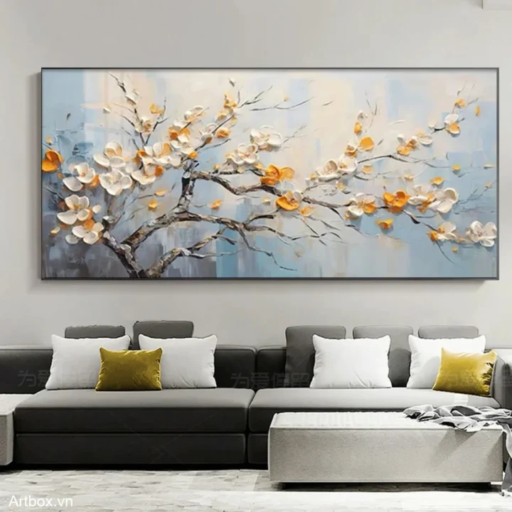 Bức tranh mang đến một khung cảnh tươi sáng và ấm áp, với những cành hoa nở rộ trong ánh nắng. Những bông hoa màu trắng và vàng sáng rực rỡ, tạo ra sự tương phản tuyệt đẹp với nền màu xanh nhạt. Kỹ thuật texture nổi được sử dụng khéo léo, làm cho các cánh hoa trở nên sống động và gần gũi hơn. Cảm xúc dịu nhẹ và ấm cúng lan tỏa từ bức tranh, khiến người xem cảm nhận được vẻ đẹp của thiên nhiên và sự tươi mới của mùa xuân. Đây là một tác phẩm nghệ thuật hoàn hảo cho không gian sống, mang lại sự thư giãn và ấm áp.