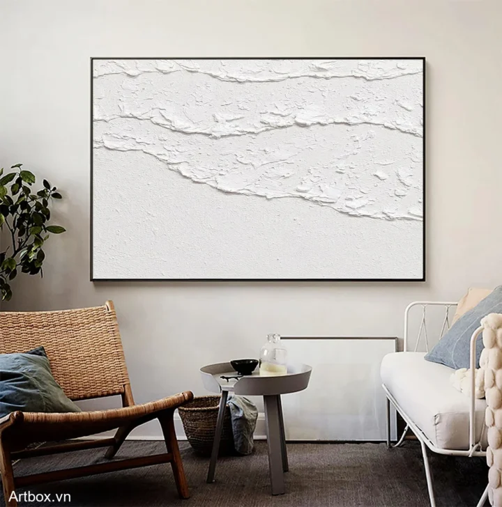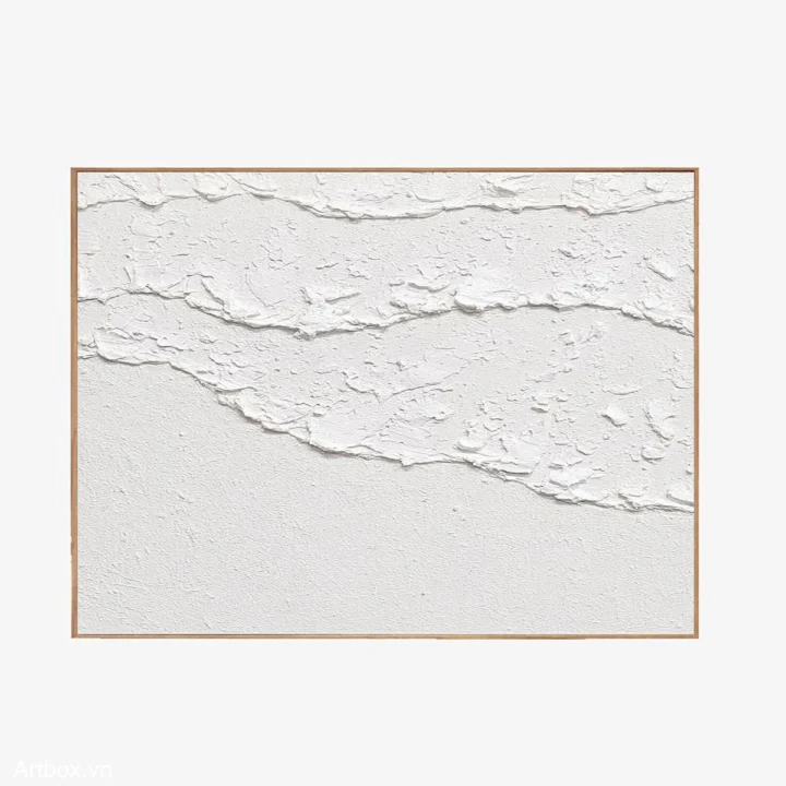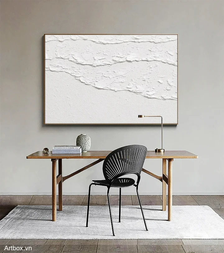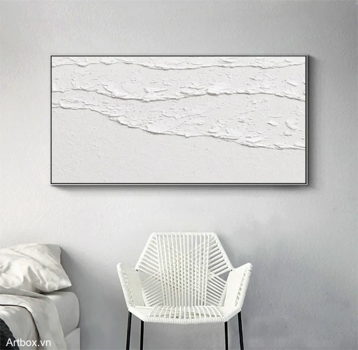 Bức tranh mang đến một cảm giác nhẹ nhàng và thanh thoát, với những đường nét chạm khắc tinh tế trên nền trắng. Sự kết hợp giữa các lớp sơn nổi tạo ra chiều sâu và độ nổi bật cho tác phẩm, khiến người xem có thể cảm nhận được sự hòa quyện giữa nghệ thuật và thiên nhiên. Màu trắng tinh khiết không chỉ mang lại sự sạch sẽ mà còn thể hiện vẻ đẹp giản dị, mộc mạc. Tác phẩm này phù hợp cho không gian sống hiện đại, tạo cảm giác ấm cúng và thư giãn cho người thưởng thức.