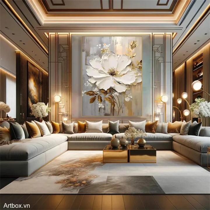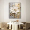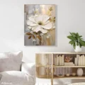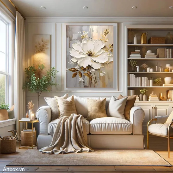 Bức tranh mang đến một vẻ đẹp thanh thoát với hình ảnh bông hoa trắng ngà nổi bật, tạo cảm giác dịu dàng và ấm áp. Các chi tiết tinh tế của cánh hoa được thể hiện qua kỹ thuật texture nổi, khiến cho bức tranh trở nên sống động và gần gũi. Màu sắc chủ đạo là trắng, kết hợp với những đường nét mềm mại và hài hòa, tạo nên một không gian thư giãn và thanh bình. Bức tranh không chỉ là một tác phẩm nghệ thuật, mà còn là điểm nhấn tinh tế cho không gian sống, mang lại cảm giác gần gũi và ấm cúng cho người thưởng thức.