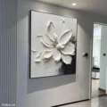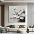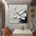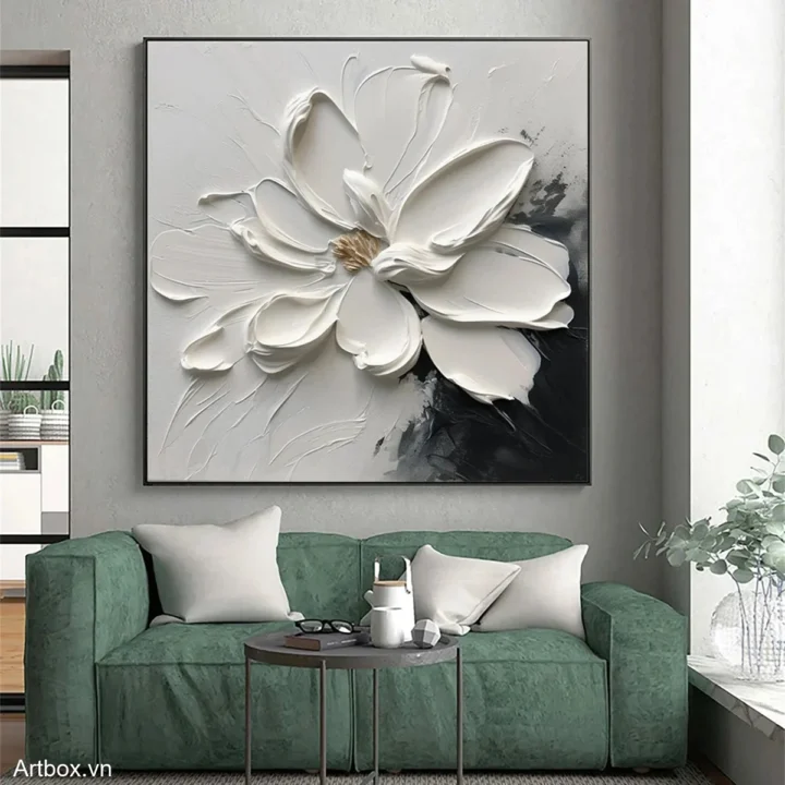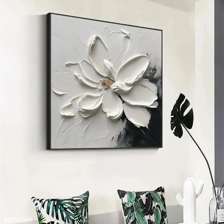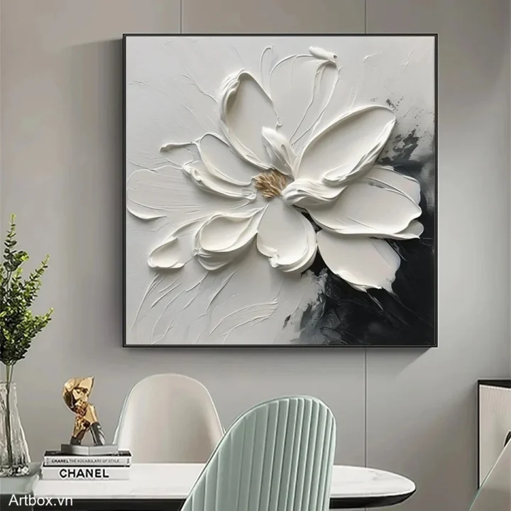 Bức tranh mang đến hình ảnh một bông hoa trắng tinh khôi, được thể hiện qua kỹ thuật texture nổi, tạo cảm giác sống động và chân thực. Các cánh hoa được vẽ với những đường nét mềm mại, uốn lượn, như đang khoe sắc trong ánh sáng dịu dàng. Nền tranh với màu sắc tối giản, chủ yếu là trắng và các sắc thái xám, tạo nên sự tương phản mạnh mẽ và thu hút. Cảm xúc dịu nhẹ, ấm áp từ bức tranh khiến không gian trở nên gần gũi và thư giãn, phù hợp cho những nơi nghỉ ngơi như phòng khách hay phòng ngủ.
