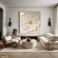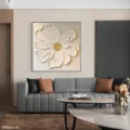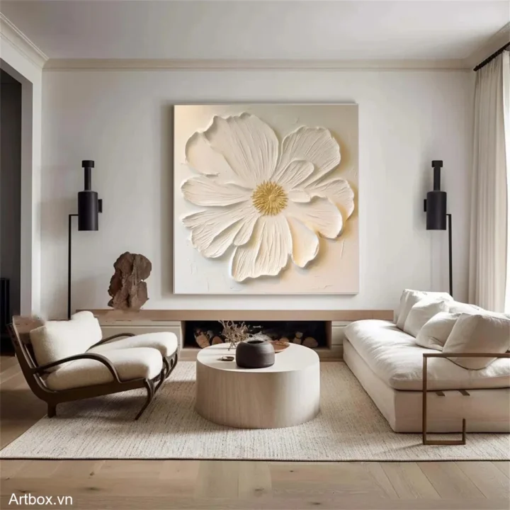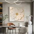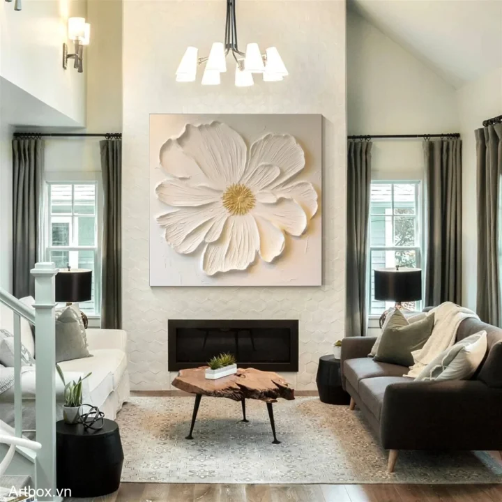 Bức tranh thể hiện vẻ đẹp giản dị của một bông hoa trắng, nổi bật với những đường nét tinh tế và họa tiết nổi ấn tượng. Màu trắng thuần khiết mang lại cảm giác thanh thoát, nhẹ nhàng, phù hợp với không gian sống hiện đại. Kỹ thuật texture nổi tạo chiều sâu cho bức tranh, khiến người xem cảm nhận được sự sống động và chân thực. Hình ảnh bông hoa không chỉ đơn thuần là một tác phẩm nghệ thuật mà còn là biểu tượng của sự thuần khiết và vẻ đẹp tự nhiên, mang đến cảm giác ấm áp và gần gũi.